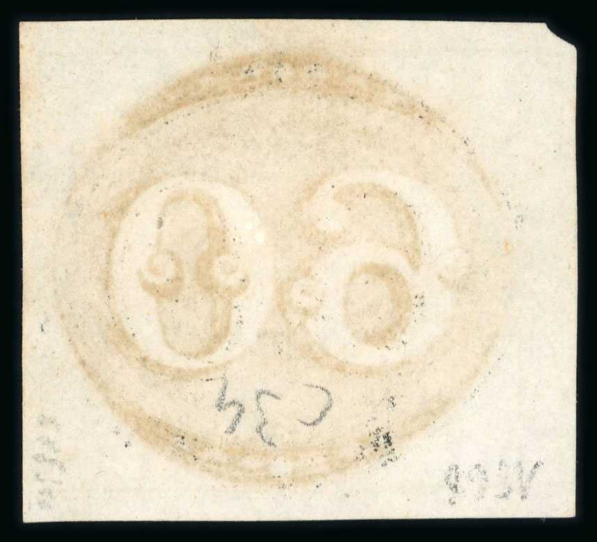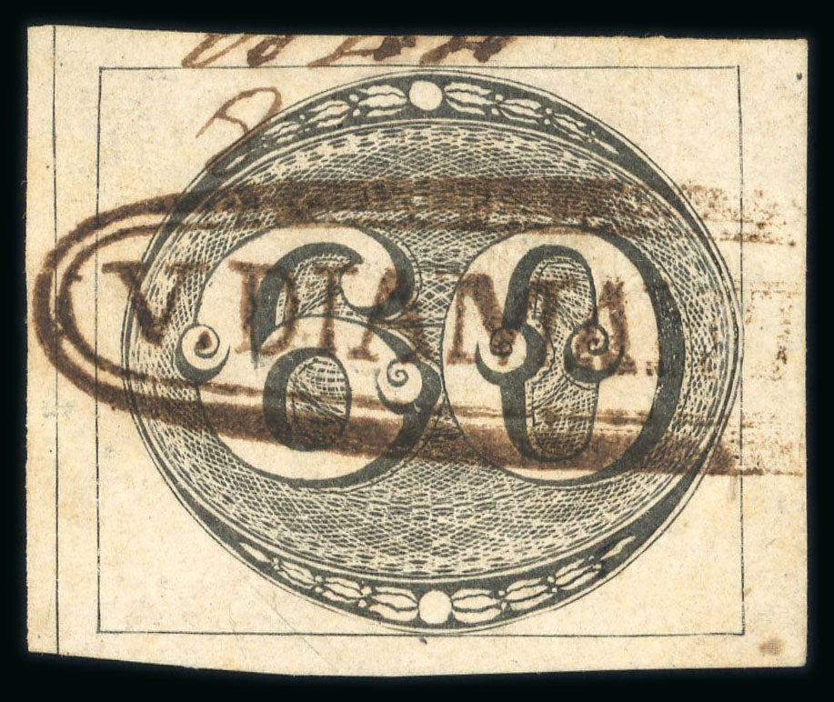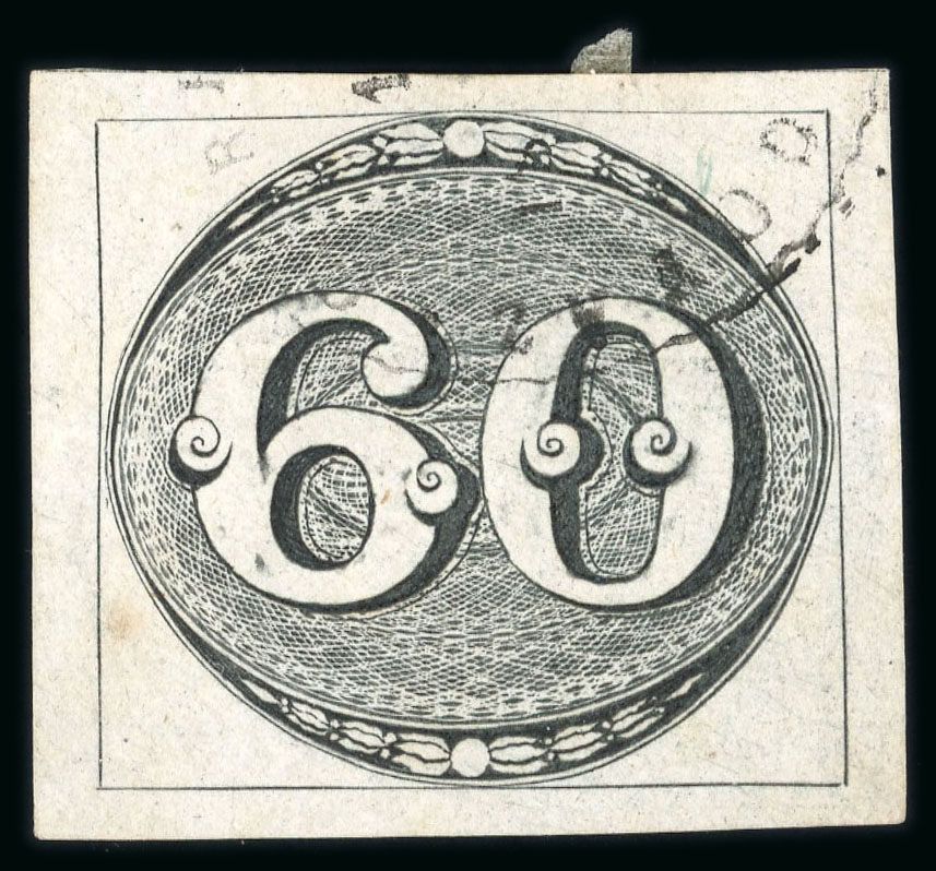 Formiga (Villa Nova DA) (MG) 60r. black, four margins fresh used with small part cancel at top (Ayres 1600), only a couple of Bulls Eyes recorded with the circular handstamp. (Image 1)