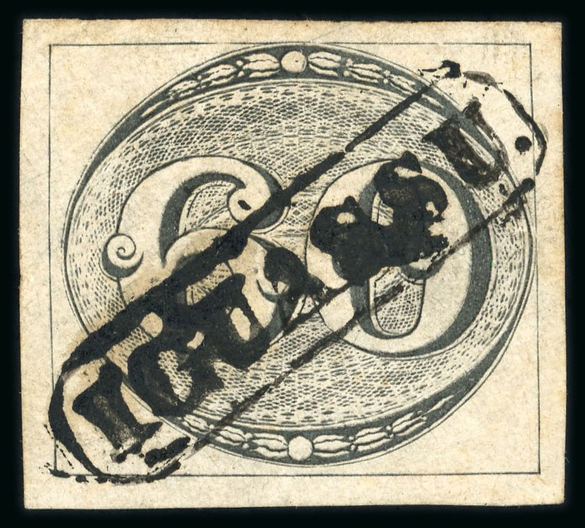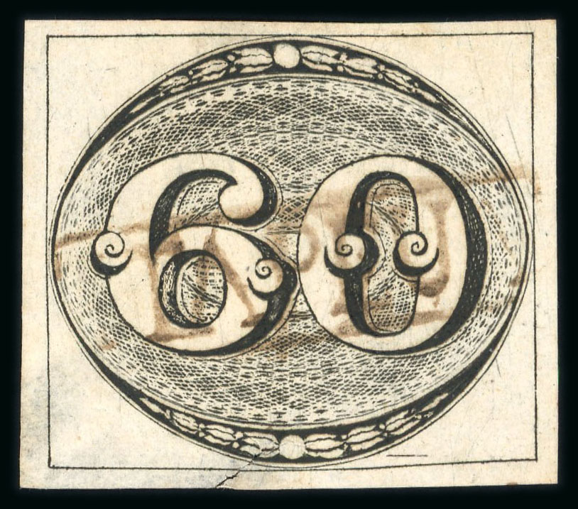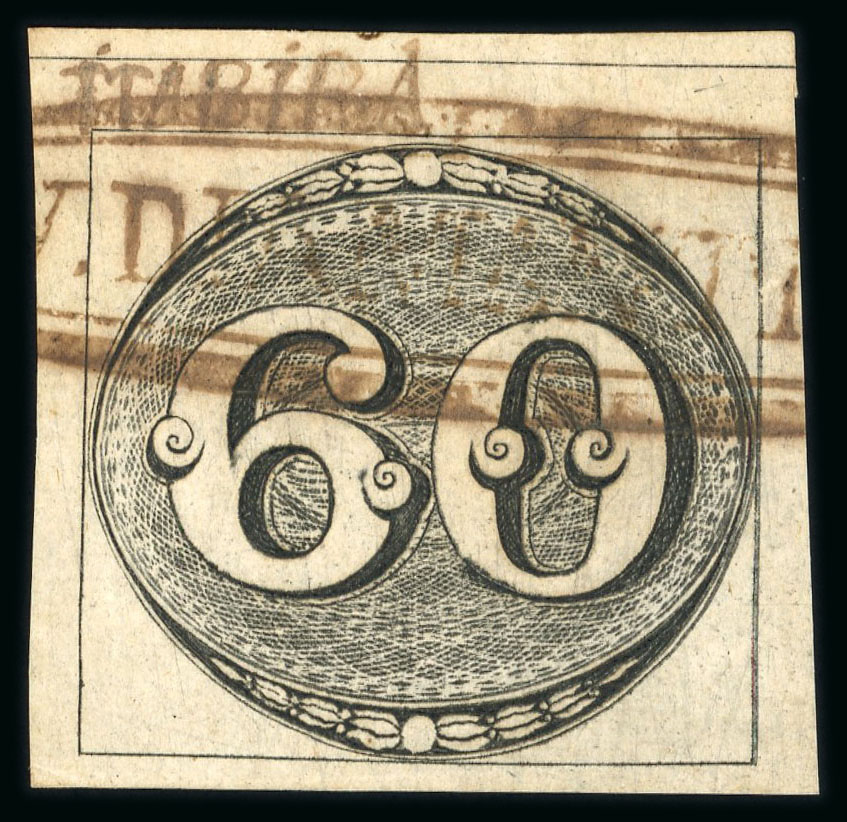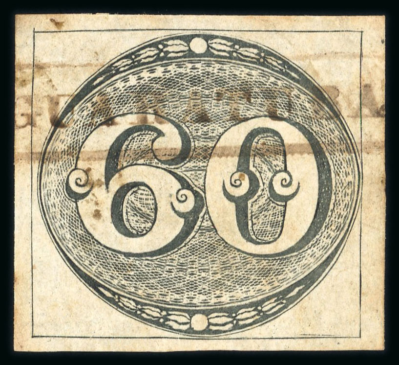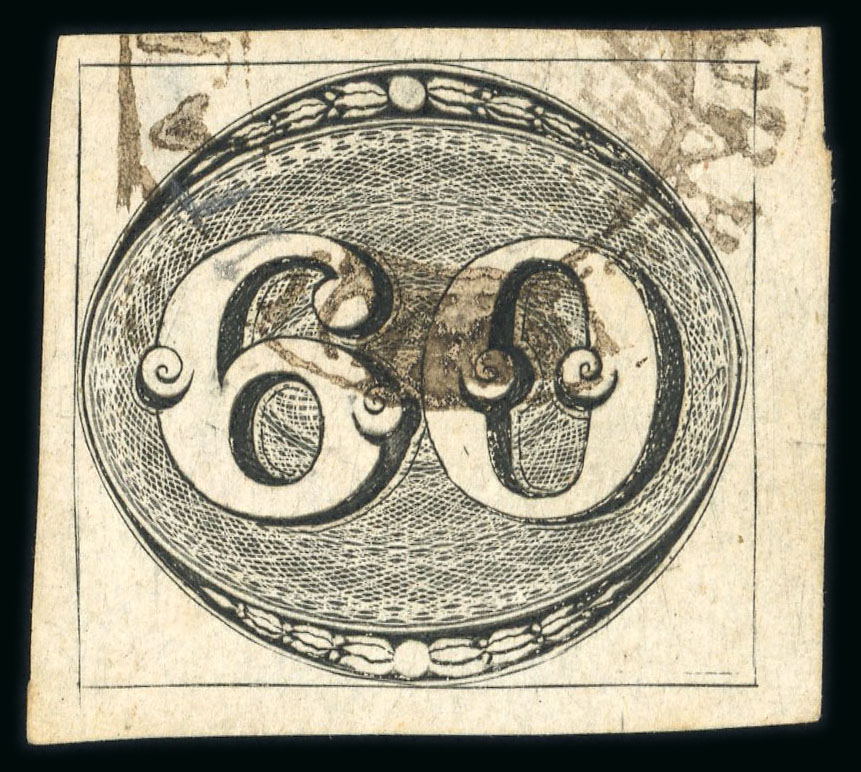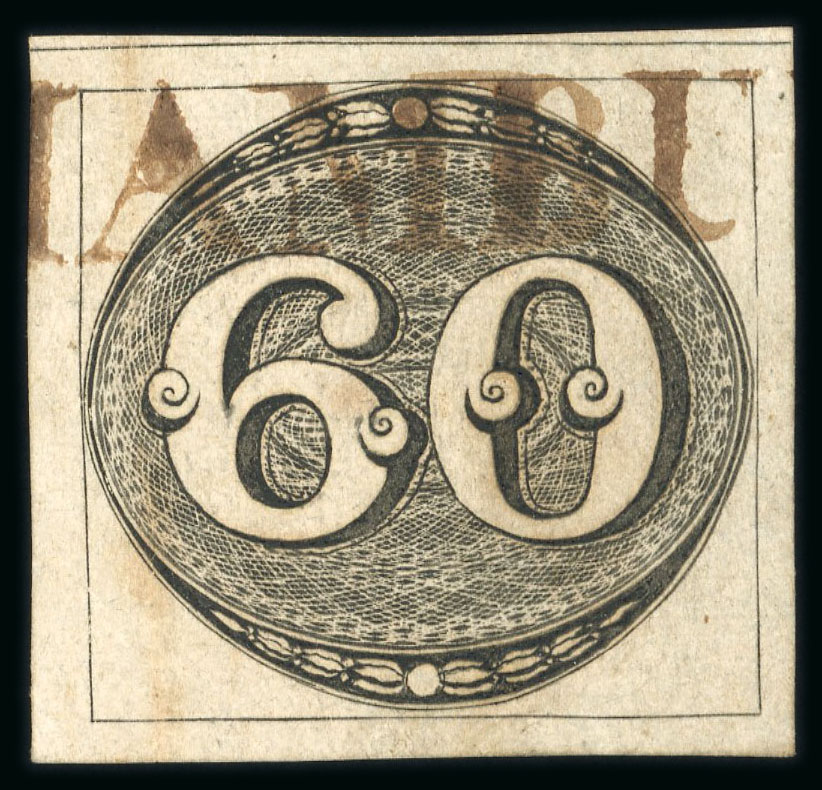 Inutiliz. (SP): 60r. black, early impression four good margins cancelled with virtually complete handstamp, slight thinning at top and some paper adhesion at centre, rare. (Image 1)