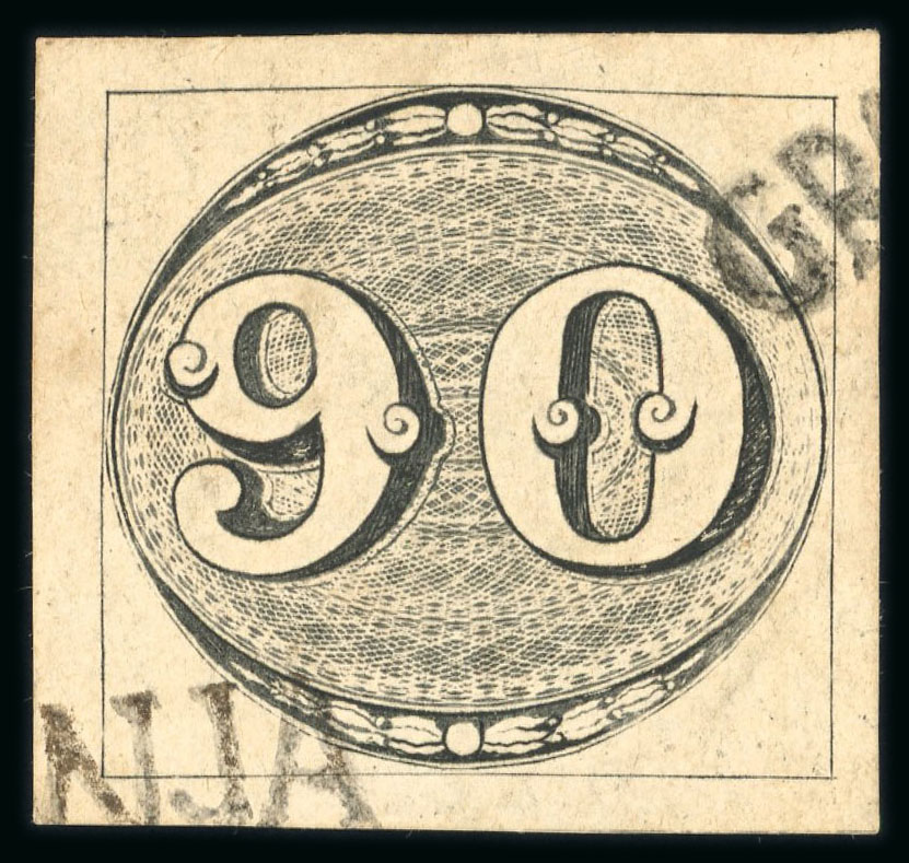 Granja (CE): 90r. black, four close margins showing part handstamp with large 'G', not listed in Ayres. (Image 1)