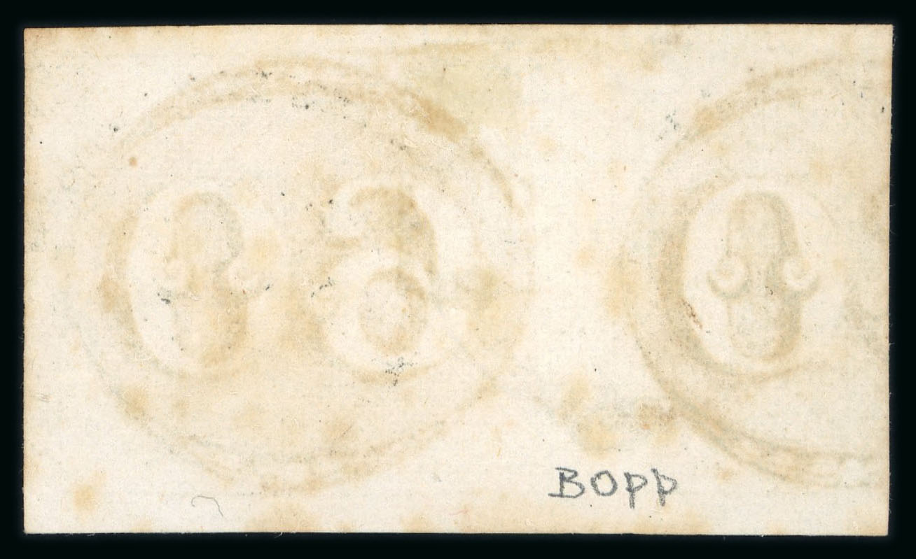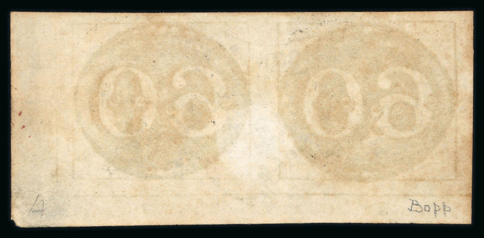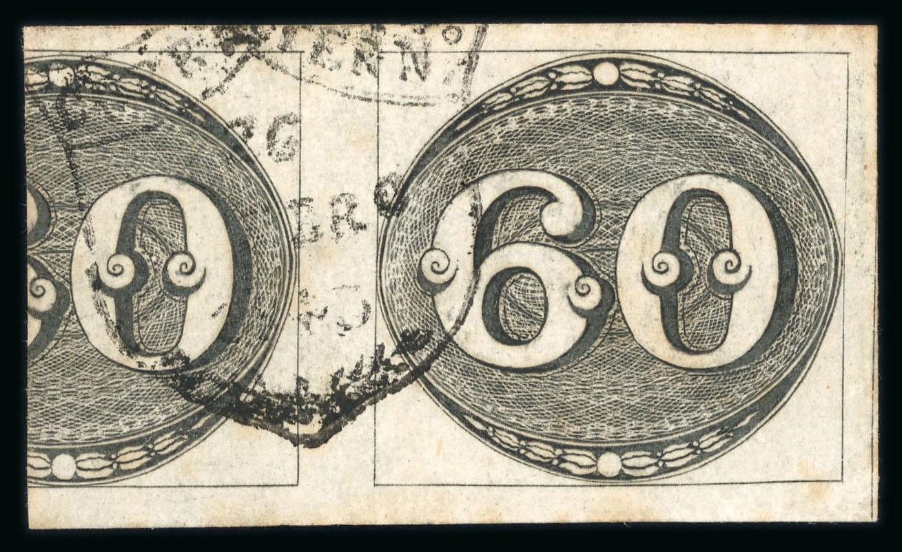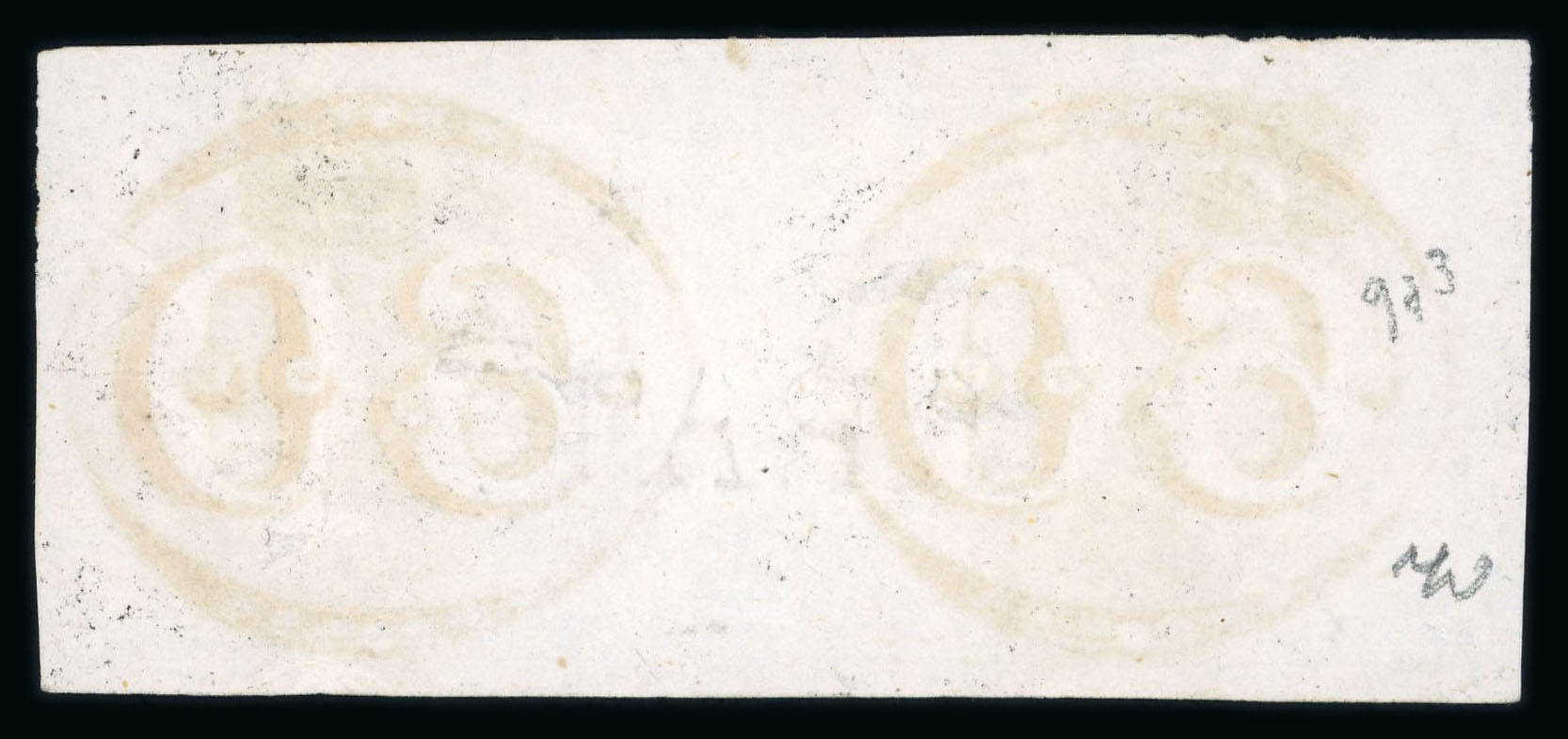 Pernambuco: 60r. black in bottom right marginal pair used with complete central ornate 'Shield' date stamp of 29 Janr 1844 (Ayres 1548), some slight paper ageing, pencil initials BOPP on reverse. (Image 1)