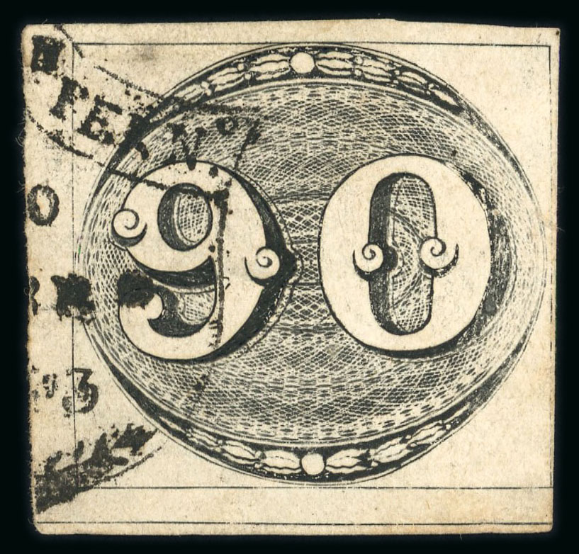 Pernambuco: 1843 90r black early impression with four margins (just clear at right side) and full dividing line at bottom, used with part Permambuco 'Shield' date stamp, the stamp showing a weak printing of black at right side, some