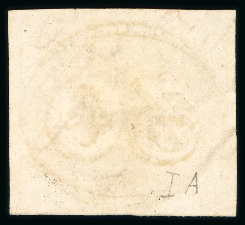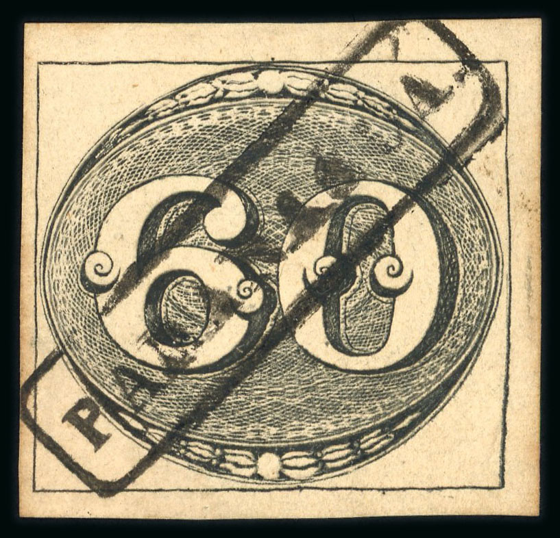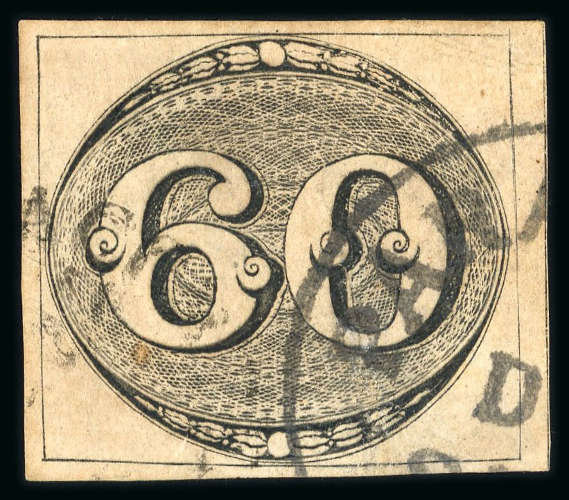 Paranagua (SP): 60r. black four close to good margins used with an almost complete strike of framed handstamp (Ayres 1384), some slight ageing at edges, rare to find so complete and as such a premium example. (Image 1)