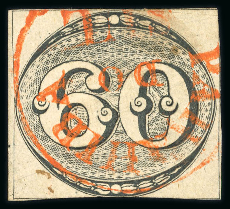 Pelotas (RS): 60r. black, four good margins used with large part handstamp in red (Ayres 1162), fine and very rare. (Image 1)