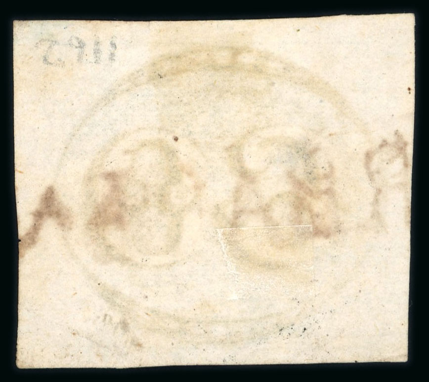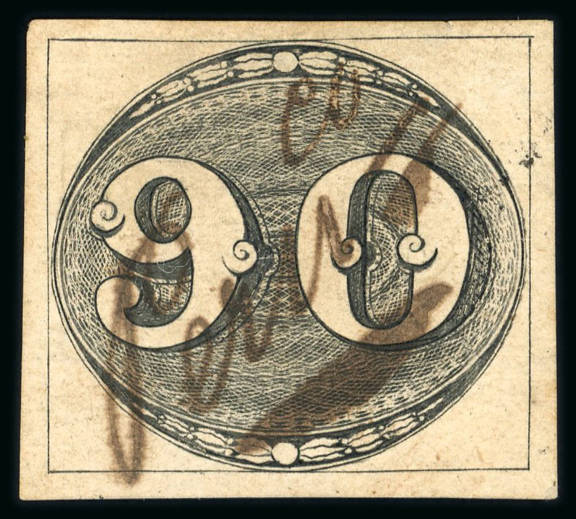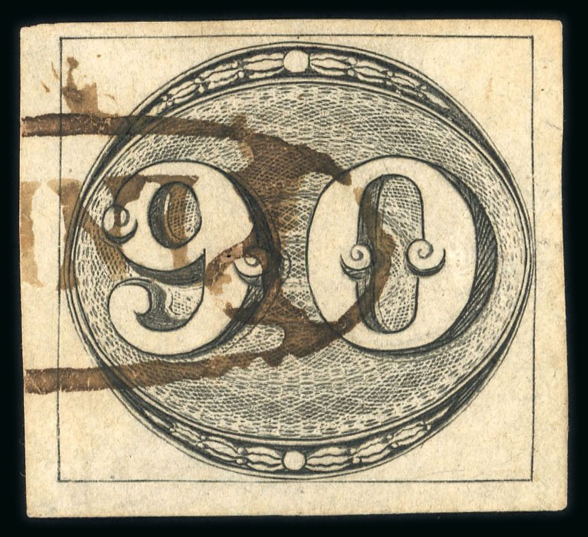 Pernambuco: 90r. black, four good margins used with complete abbreviated manuscript cancel, three tiny holes from ink erosion on vertical stoke of "n", an attractive example. (Image 1)
