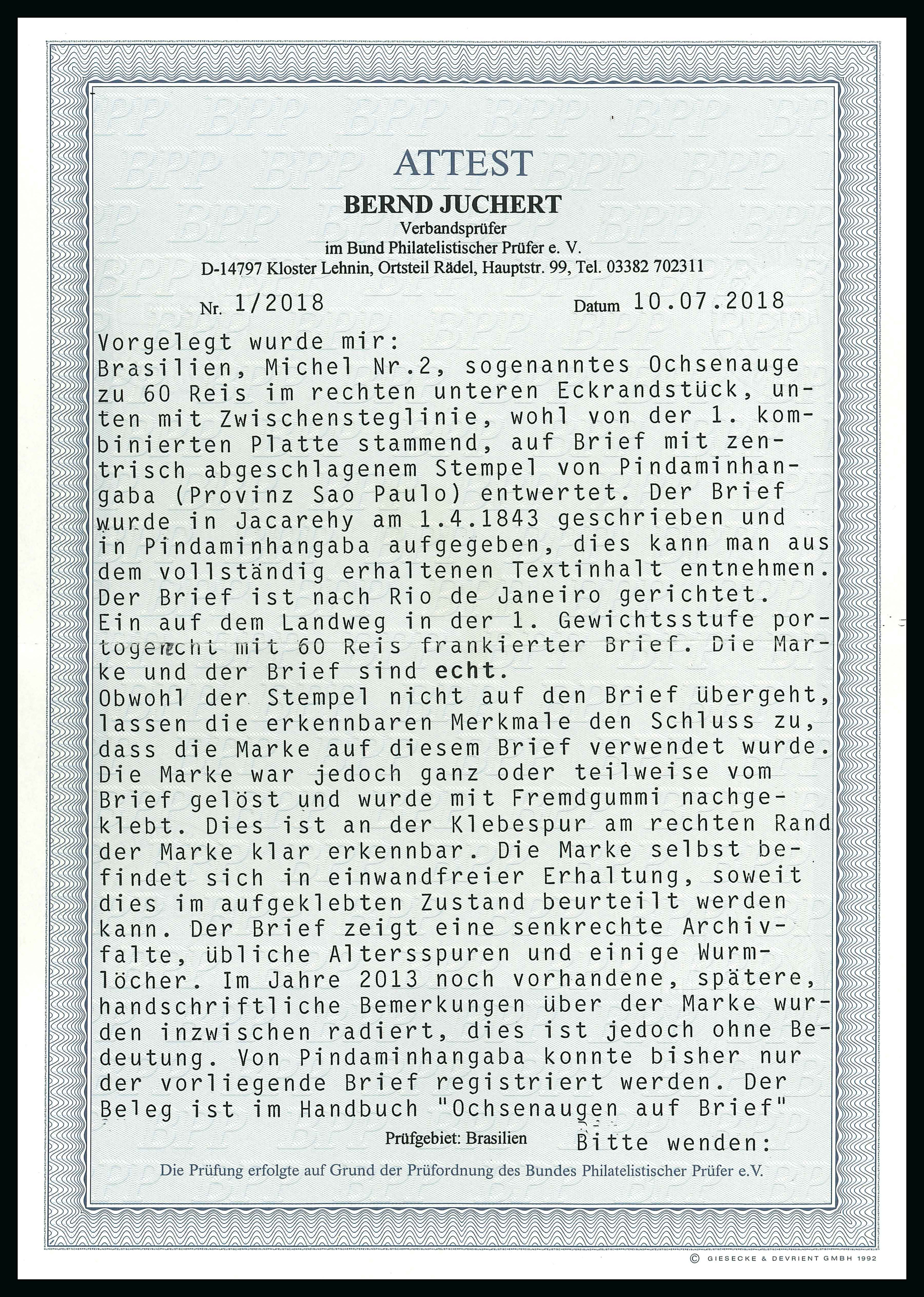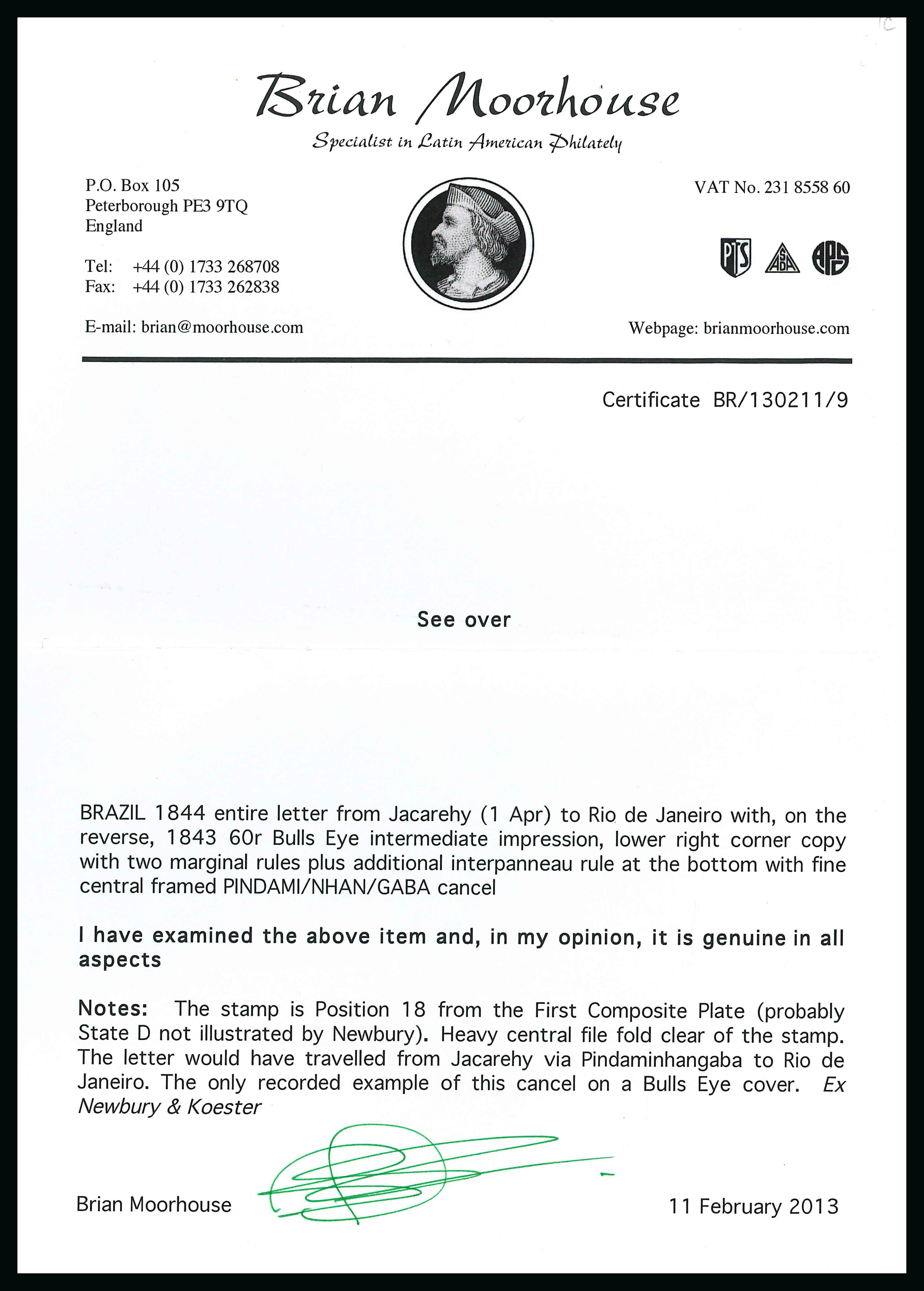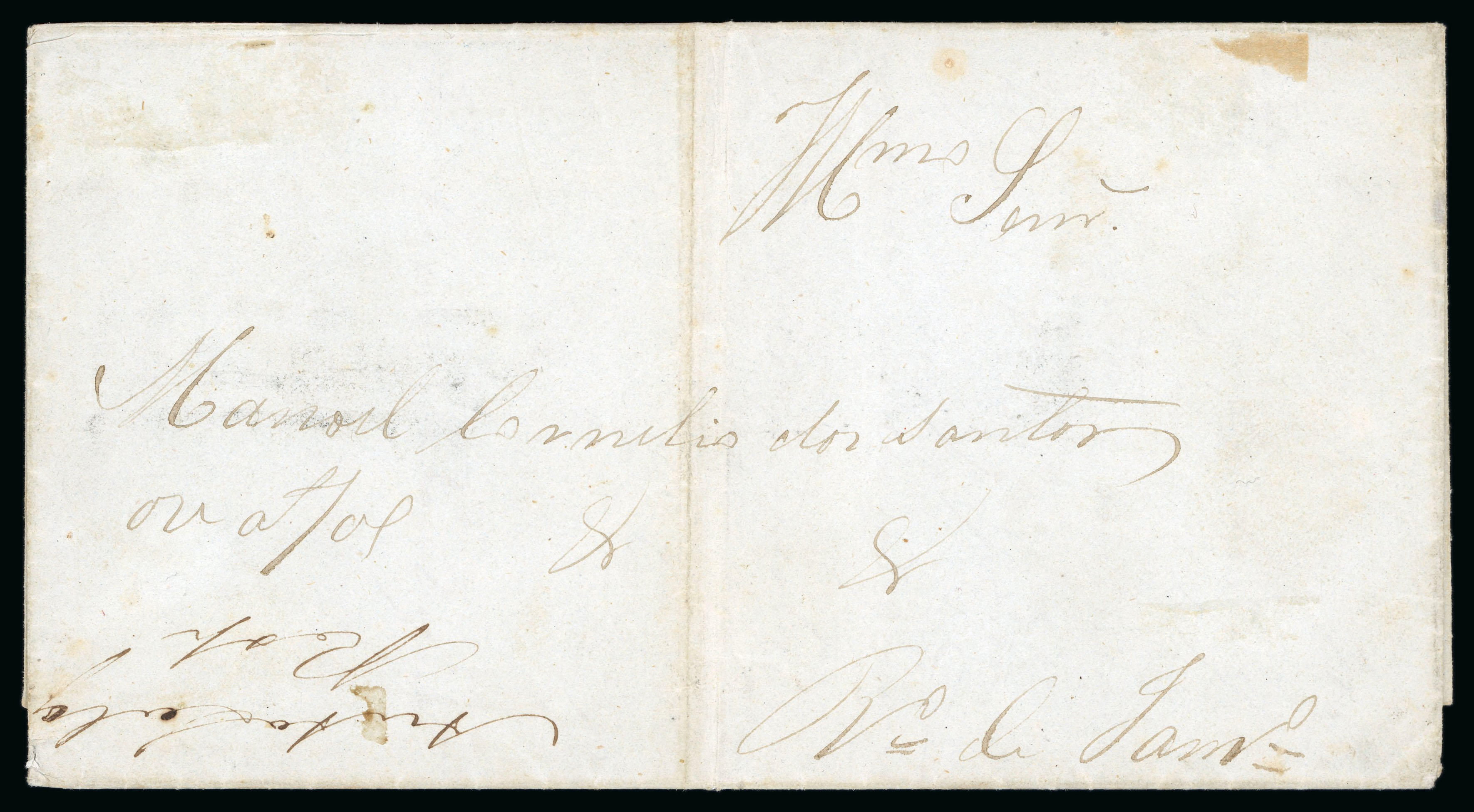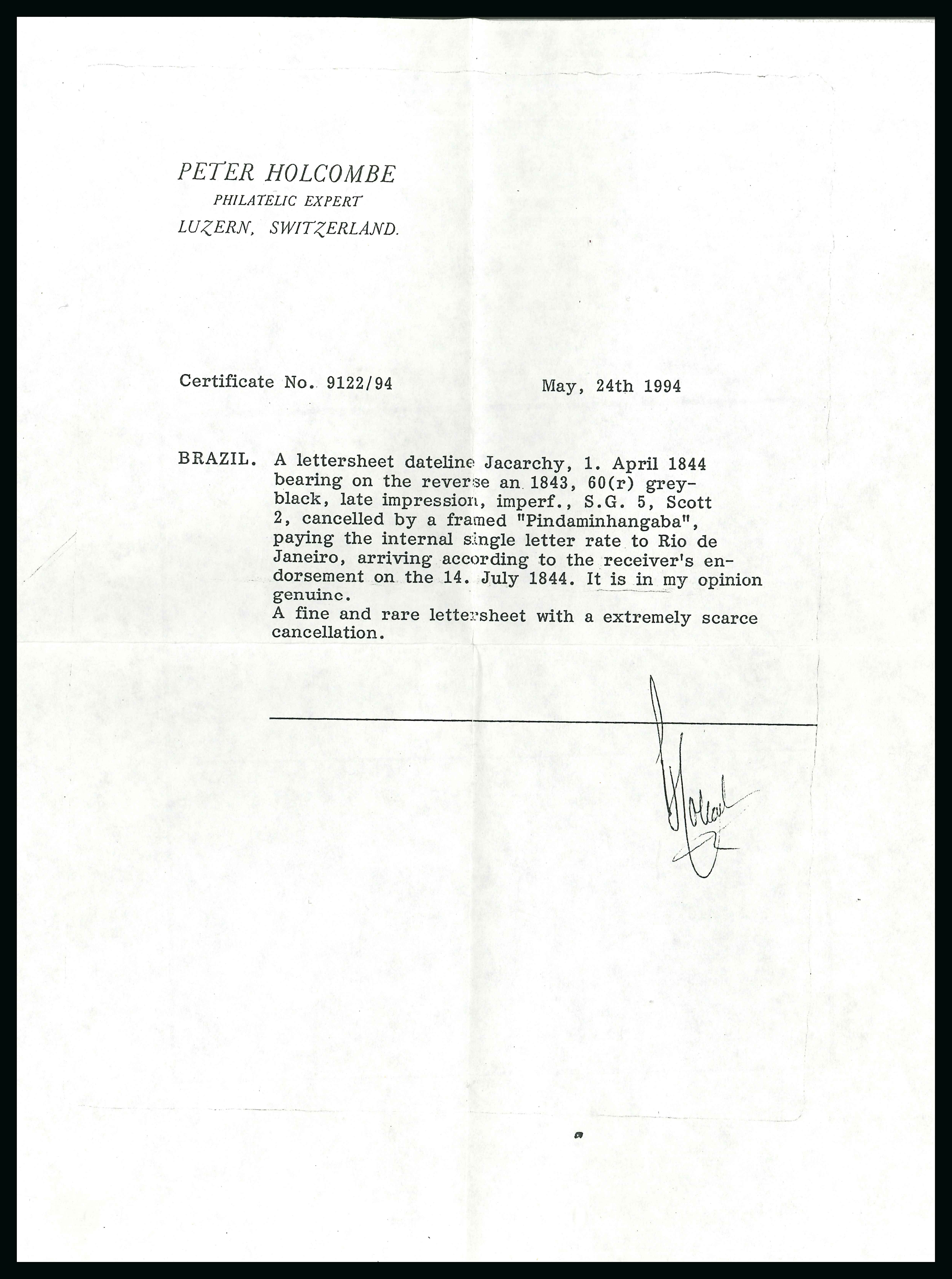 base, a magnificent "semi-xiphopagus" example used on reverse of 1st April 1844 entire letter from Jacarey via Pindaminhangaba to Rio de Janeiro, with the stamp cancelled in transit by framed "PINDAMI/NHAN/GABA" hs in brown (Ayres 1402). A manuscript