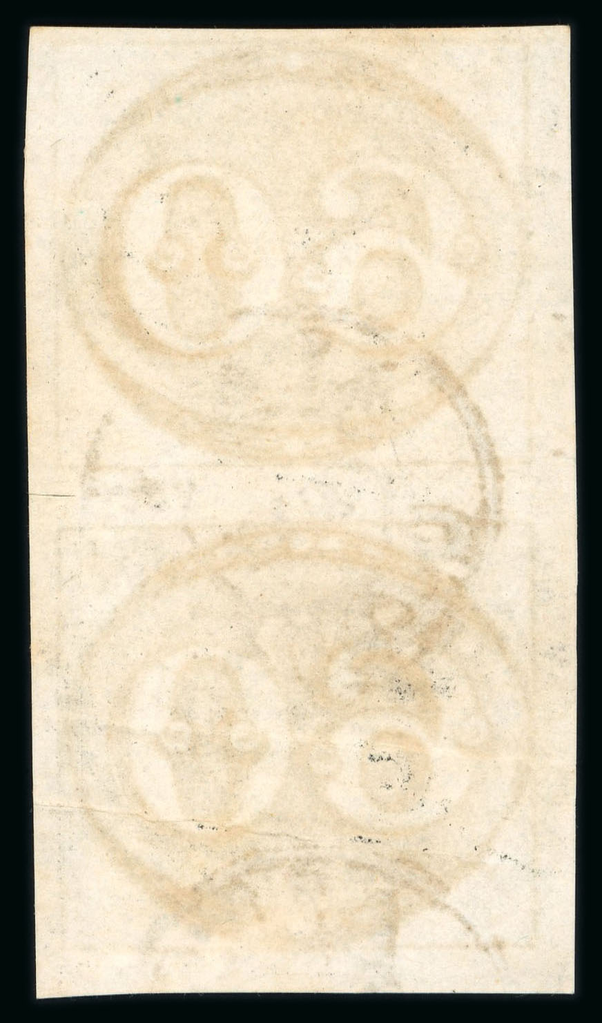 Porto Allegre, Sul (RS): 60r. black, good to large margin vertical pair cancelled with central handstamp and partial strike at base (Ayres 1586), small scissor cut in margin between pair at right, bottom stamp with light horizontal