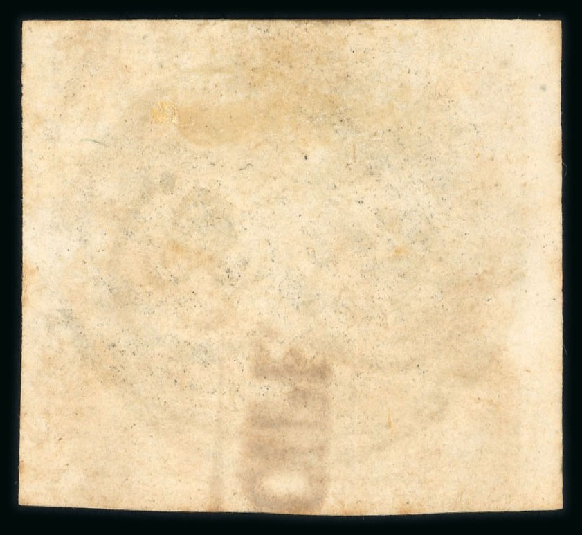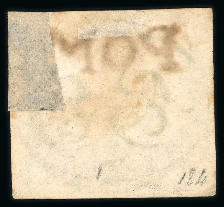 1843, 60r black, late impression, position 18 from the First Composite Plate, a key positional piece from the lower left corner of the pane, large to enormous margins on two sides clearly displaying the corner plus an additional interpanneau rule at