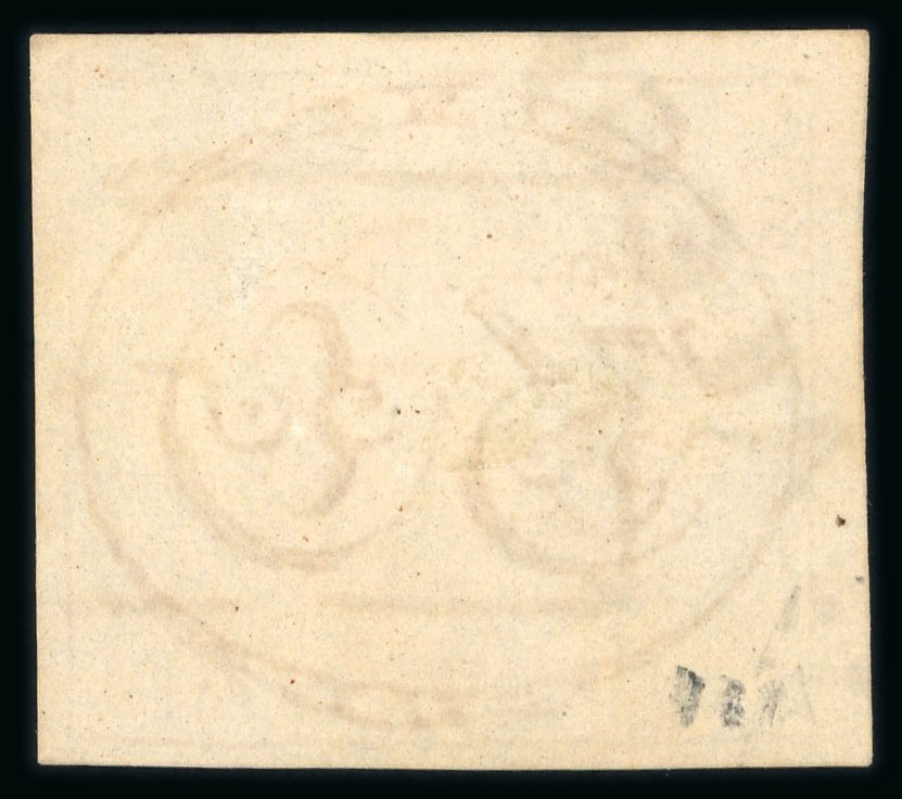 Pouzo Secco (RJ): 60r. black, mostly close margins used with large part brownish framed handstamp, reading up at an angle resulting in a nearly complete strike, very rare. (Image 1)