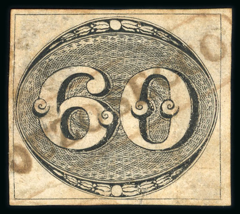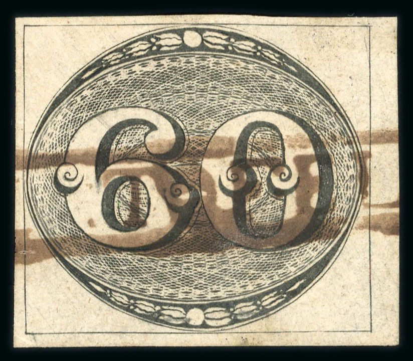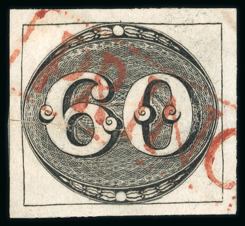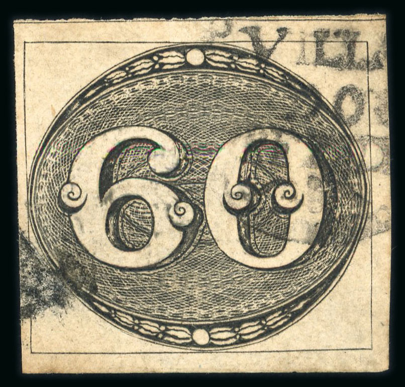 Villa de Prezidio (MG): (nowadays Rio Branco) 60r. black early impression, four close to good margins with only tiny imperfections, with good part of circular framed handstamp (Ayres 1601), fewer than five recorded, this example is