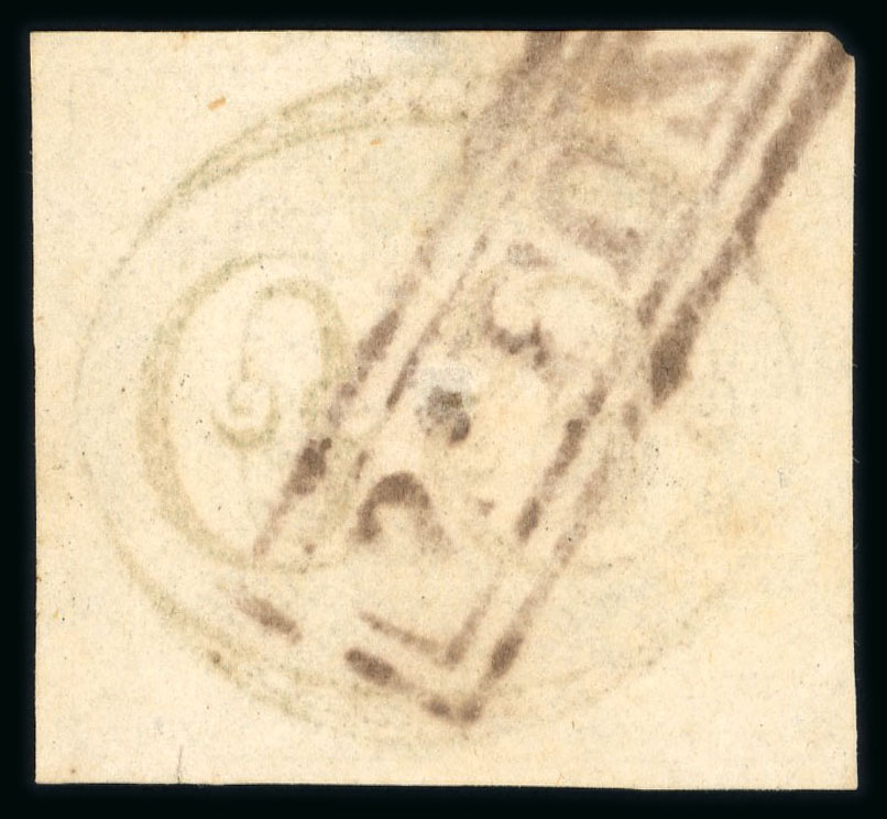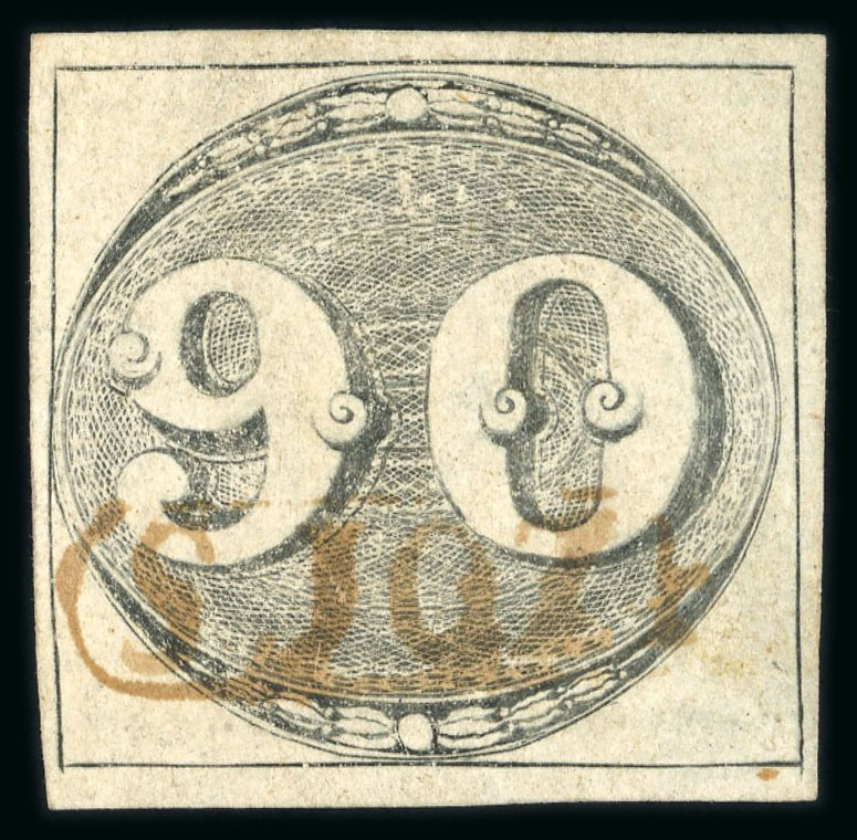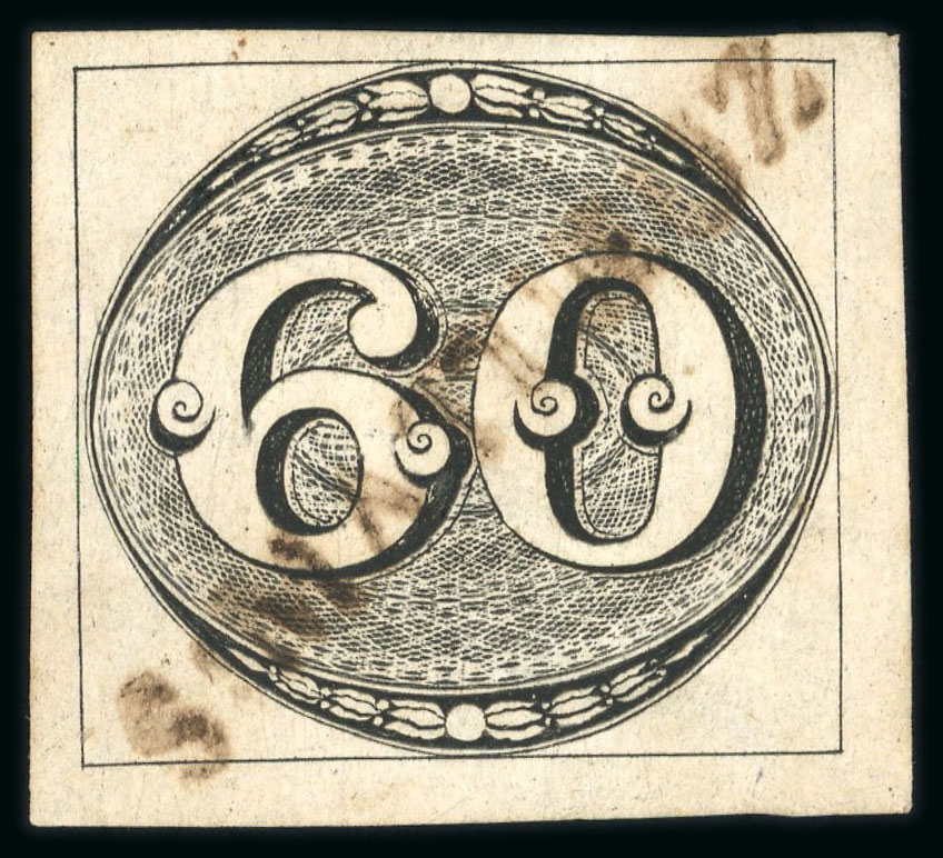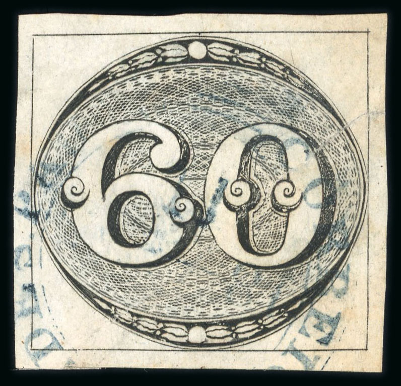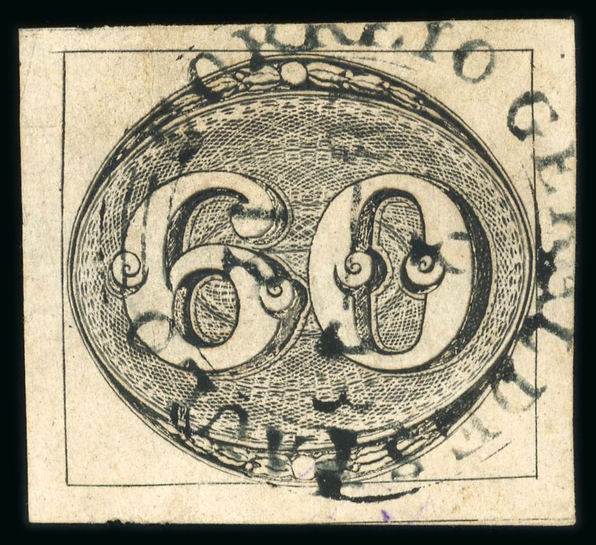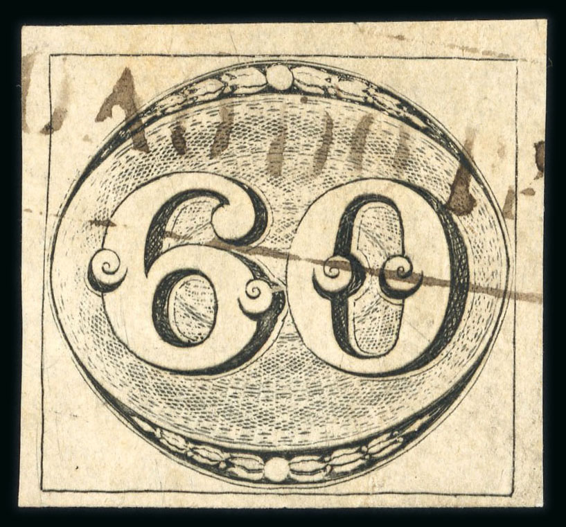 Sao Matheuz (ES): 60r. black, four good margins used with complete straight-line handstamp (Ayres 1184) that runs diagonally from bottom left, a very fine example. (Image 1)