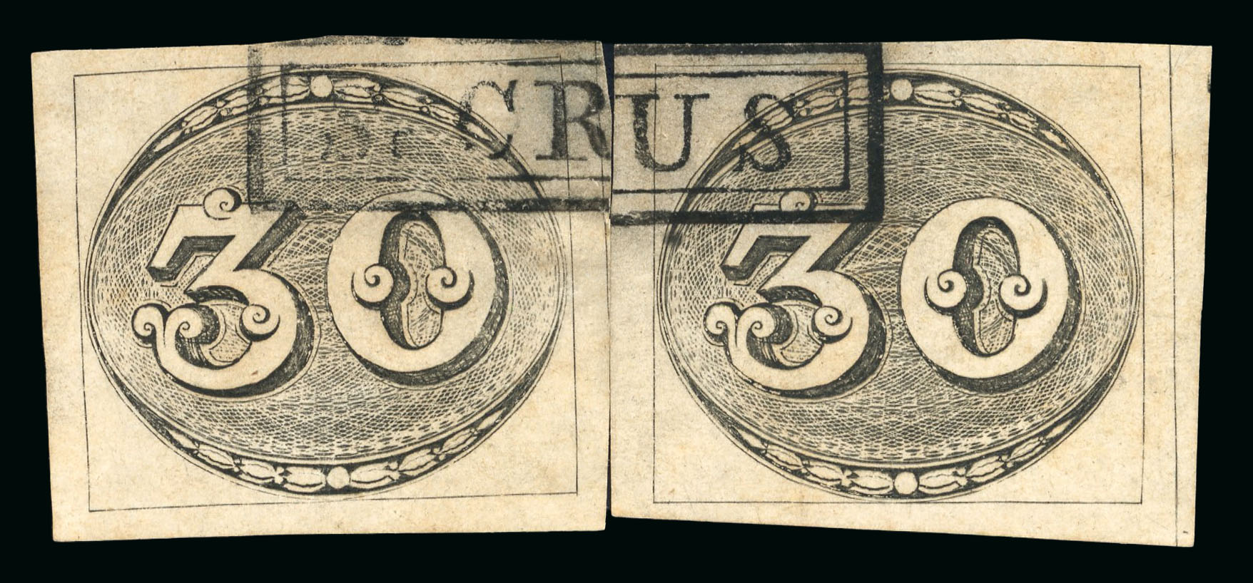 Santa Crus (GO): two single 30r. black formerly used together on the same letter cancelled by full strike of very rare framed handstamp S.CRUS, both with four good to large margins, right-hand example with full dividing line at right, the