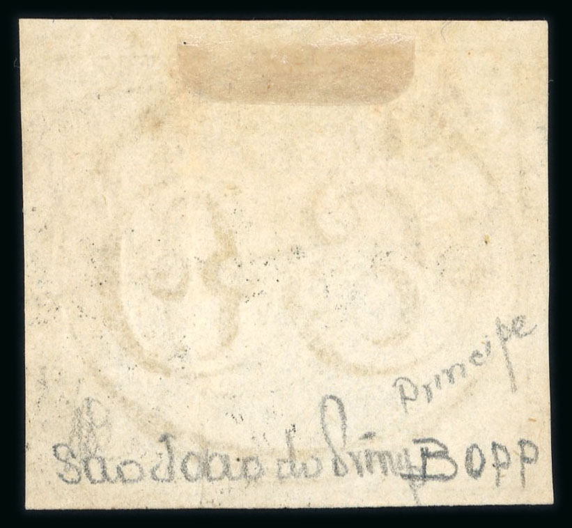 Sao Joze (GO): 60r. black very close to large margins with complete dividing line at right, used with complete rectangular-framed handstamp at centre with manuscript below, as illustrated in Ferreira page 177, the stamp with ink staining