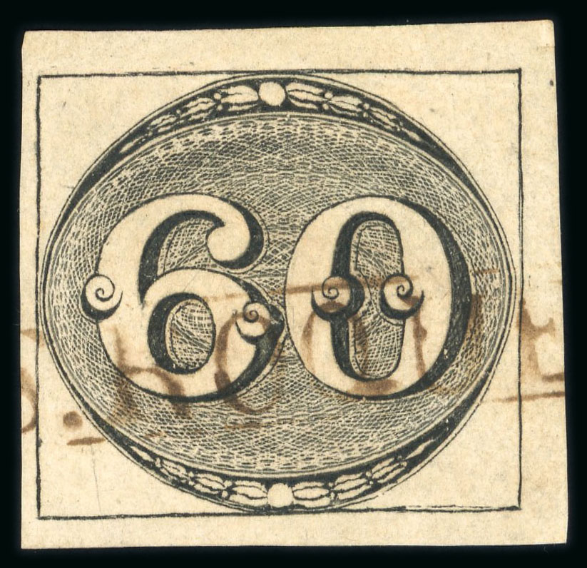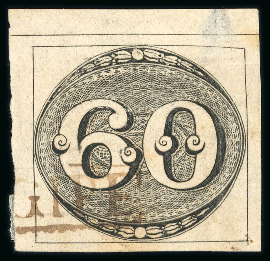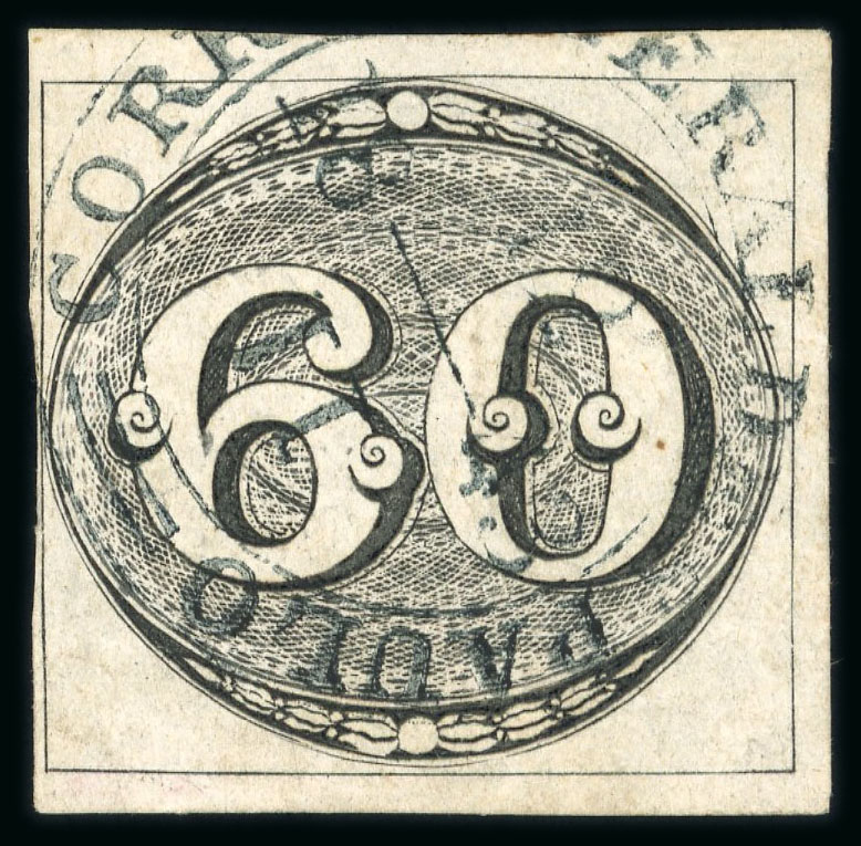 Silveiras (SP): 60r. black, four good to close margins used with part small framed handstamp reading upwards, pencil initials on reverse, as illustrated in Ferraria page 188. (Image 1)
