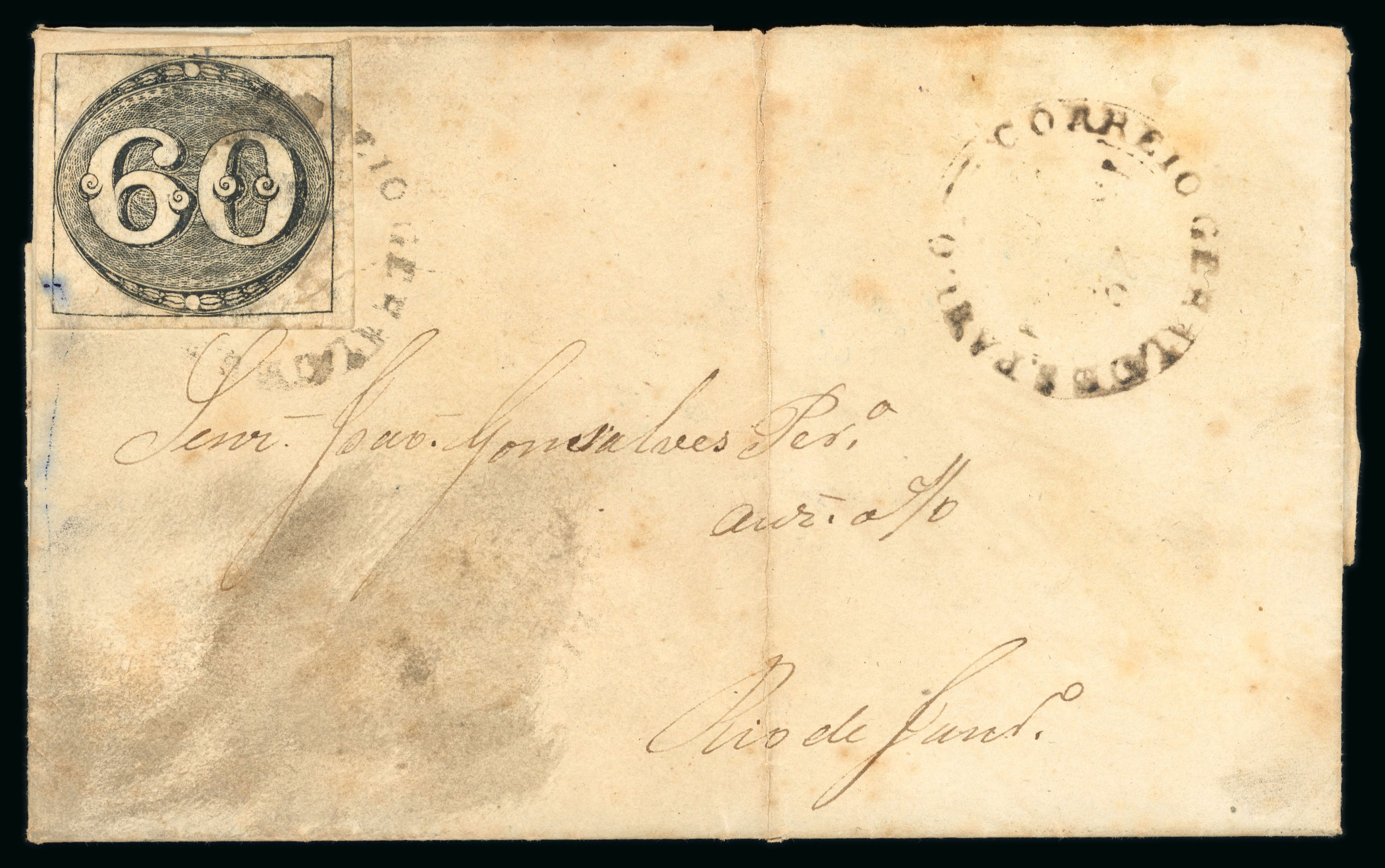 Sao Paulo, Correio Geral de: 1844 (18.6) fragile entire to Rio de Janeiro franked 60r. black with margin just touched and smaller faults, tied by large date stamp, repeated at right, the letter was originally written at Campinas. A heavy