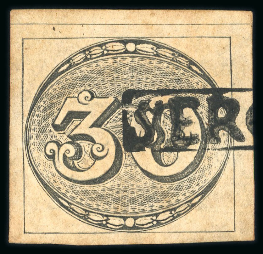 Sobral (CE): 30r. black, good to large margins with full dividing line at base used with part straight-line handstamp at top (Ayres 1177) and part manuscript date at base, some heavy ink erosion causing holes within stamp. (Image 1)
