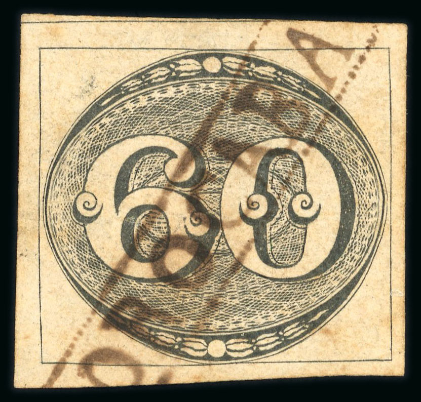 Silveiras (SP): 60r. black, four good even margins used with bold strike of framed, straight-line handstamp in reddish brown (Ayres 1502), a choice example. RHM 6000 USD (Image 1)