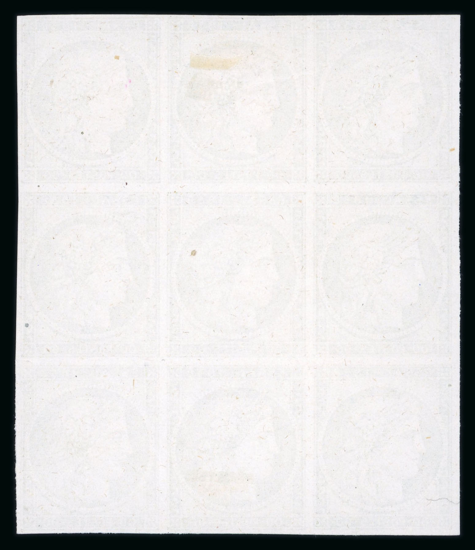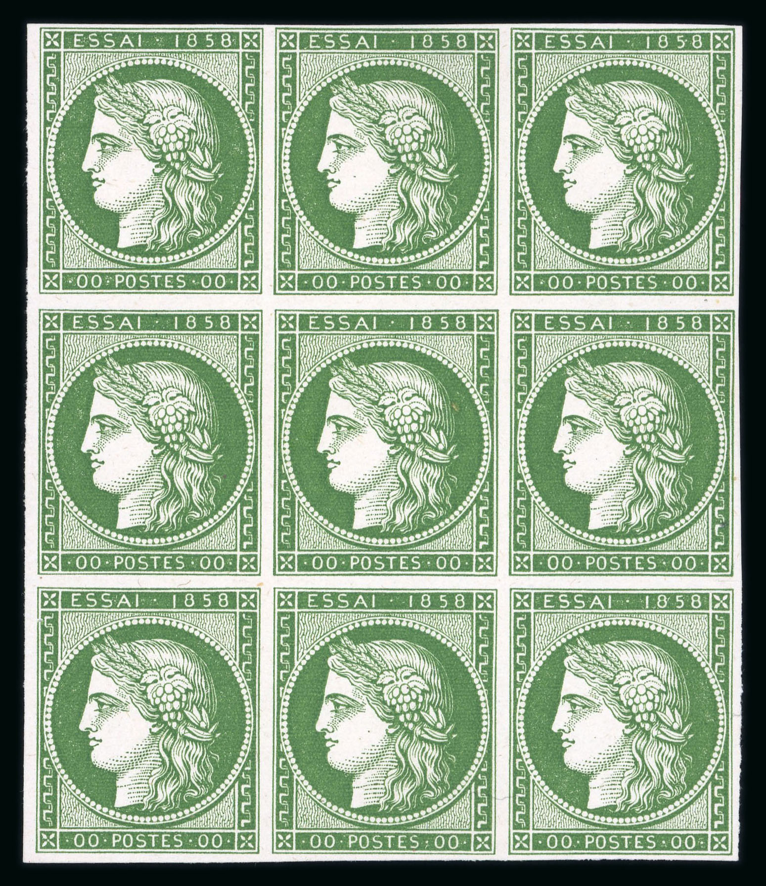 1858 French Essay: Block of nine (3x3) of the green "Cérès 1858" plate proof, very fine condition. (Image 1)