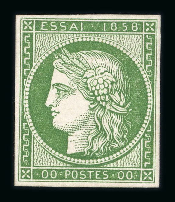1858 French Essay: Green "Cérès 1858" on thick card. Very rare, very fine. (Image 1)