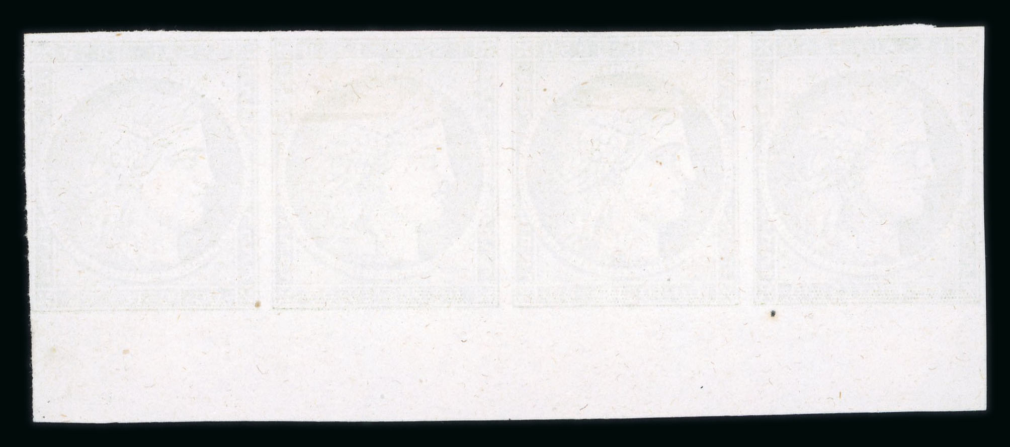 1858 French Essay: Lower marginal strip of four of the green "Cérès 1858", very fine condition. (Image 1)