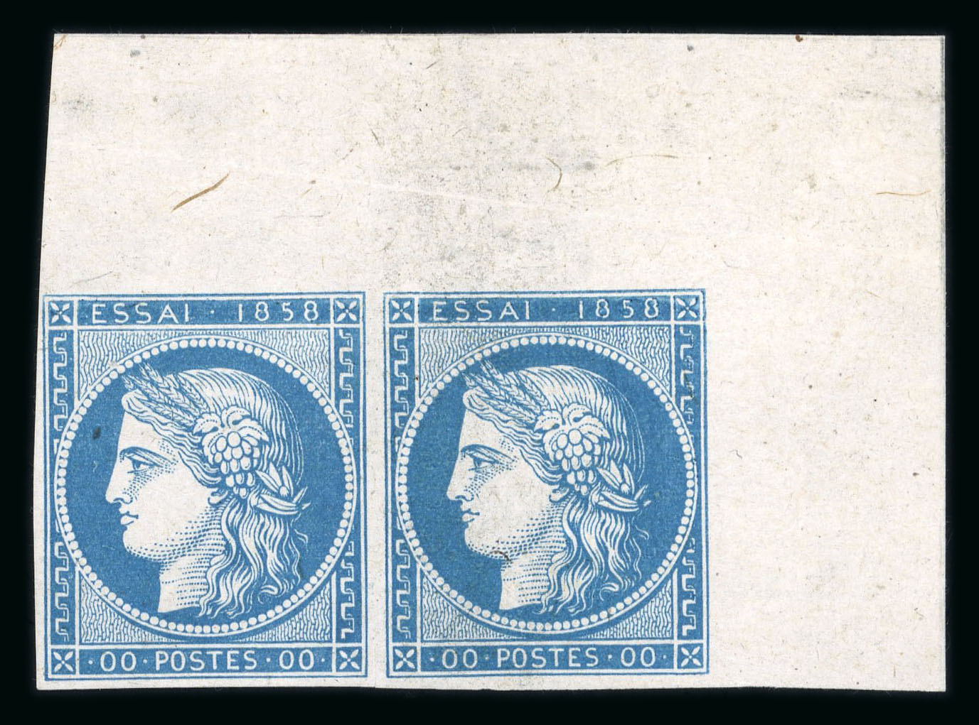 1858 French Essay: Upper right corner pair of the blue "Cérès 1858" on very thin paper. Tiny faults due to the paper used, but very rare. (Image