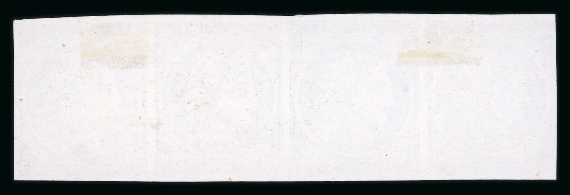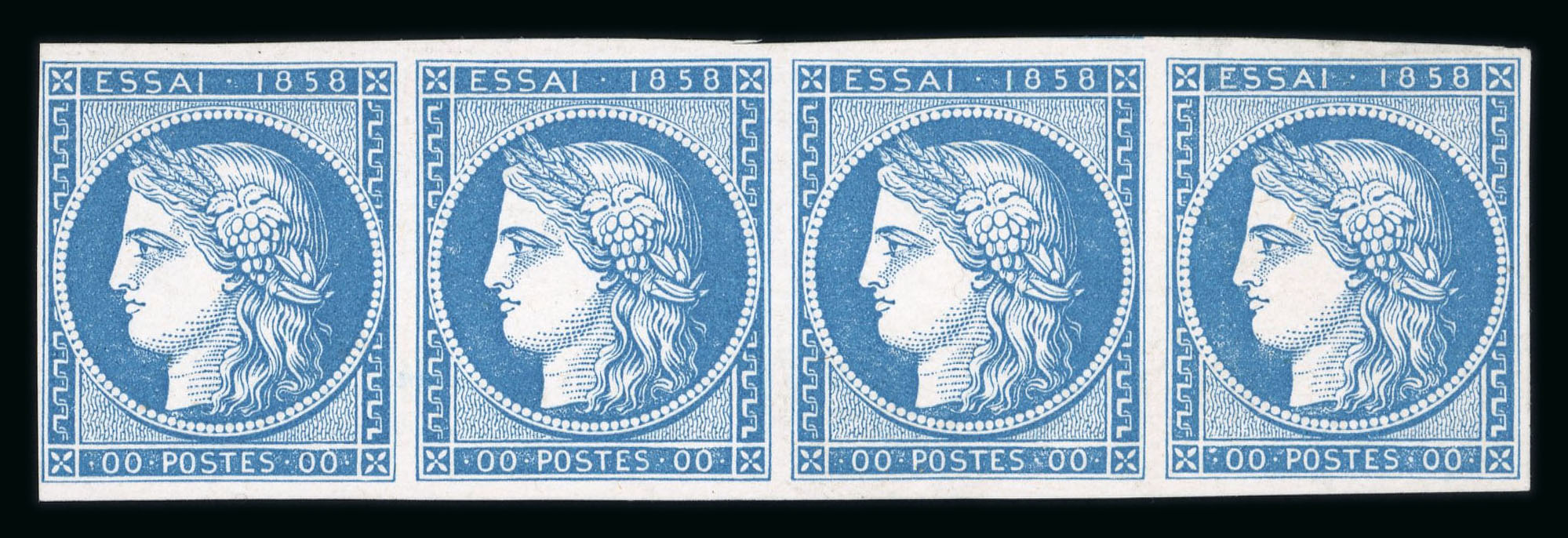 1858 French Essay: Strip of four of the blue "Cérès 1858". One small thin of no importance, otherwise very fine. (Image 1)