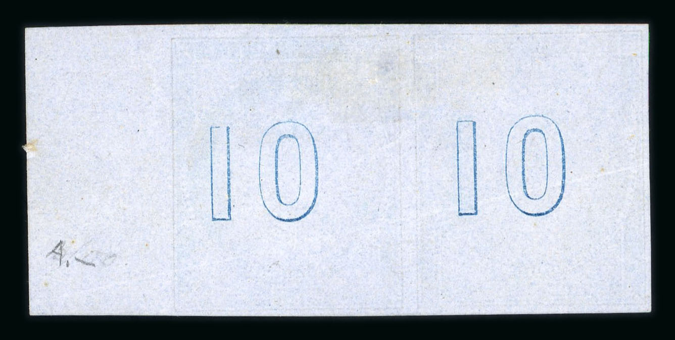 1858 French Essay: Marginal pair of the blue on bluish paper of the "Cérès 1858" with Control Numbers "10" on the back. Oblique light crease, barely noticeable, otherwise in fine to very fine condition. (Image 1)