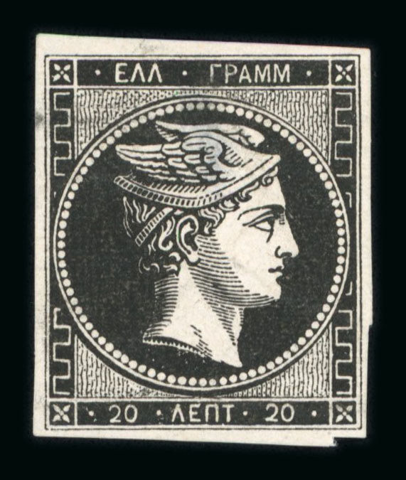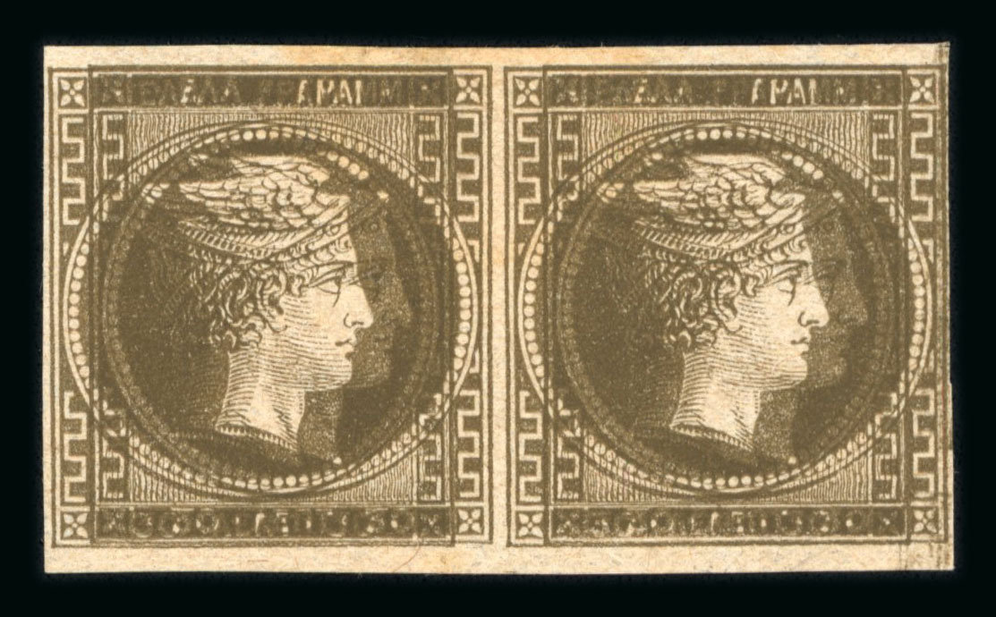20 lepta plate proofs in black on thin paper, two singles, (Constantinidès n° 5 ES. I.1 & 5 ES. I.2). One with a small thin, but a crisp looking pair. (Image 1)