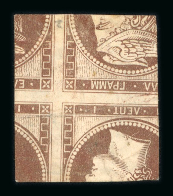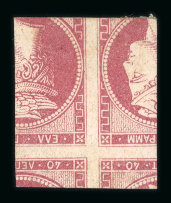 40 lepta plate-proof in black with good to large margins (Constantinidès n° 6 ES. I.) in left sheet marginal block of four, small surface abrasions on top left stamp otherwise fine. (Image 1)