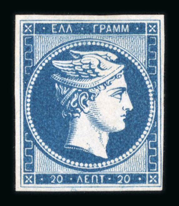 20 lepta blue plate proof on thin paper with plate flaw "cercle brisé" (broken circle) (Constantinidès n° 5 ES. III.3). Well preserved example. (Image