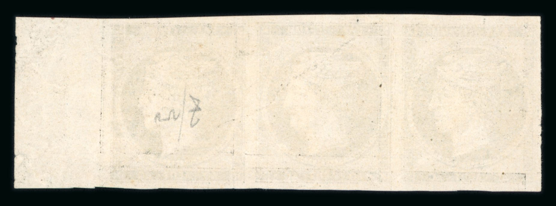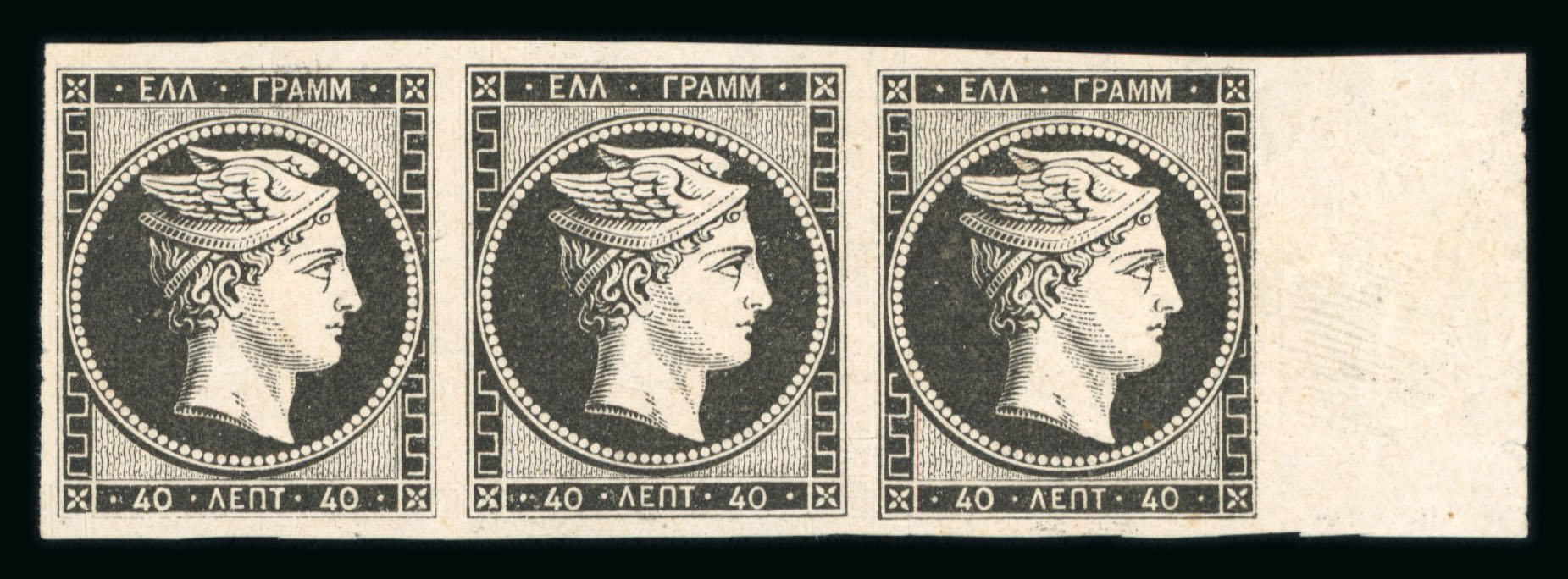 40 lepta plate proof in black, marginal strip of three (Constantinides n° 6 ES. I), well preserved. (Image 1)