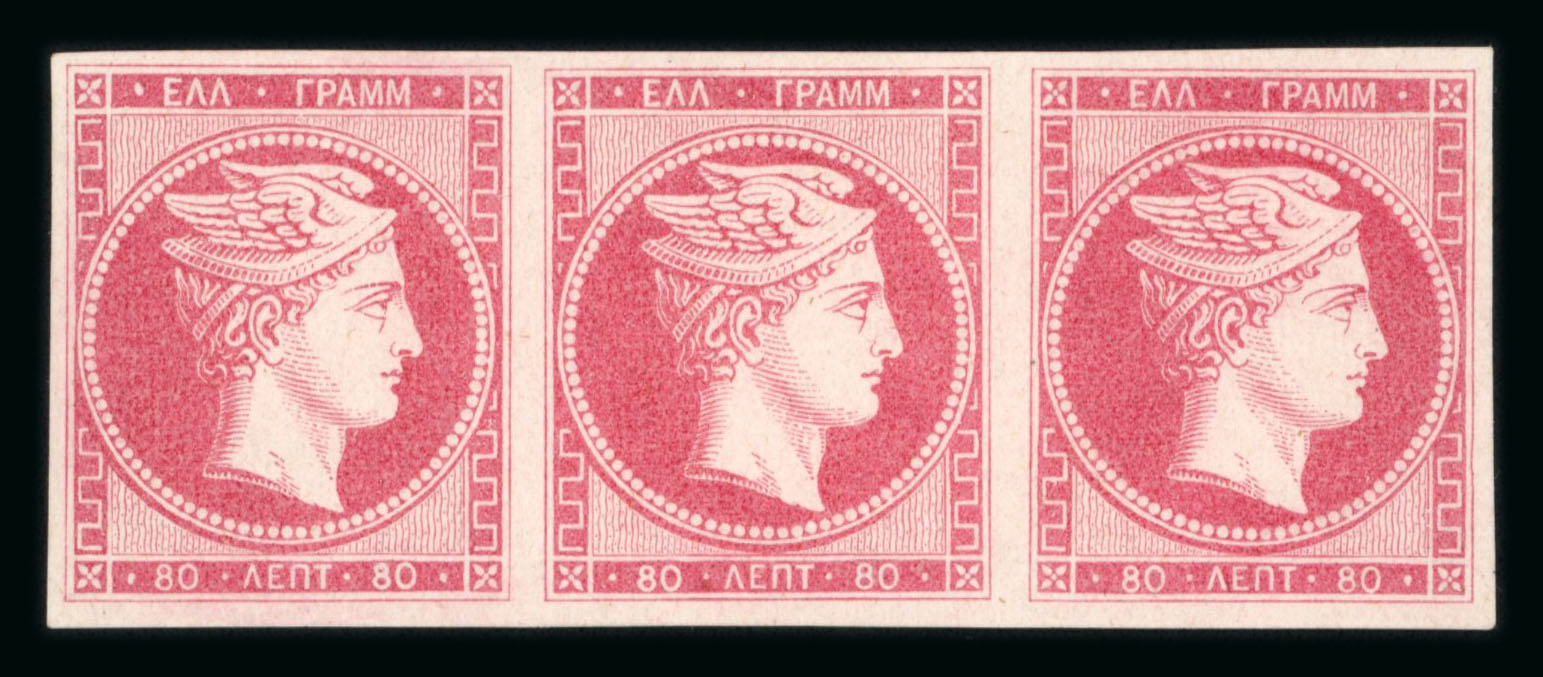 80 lepta plate-proof in rose carmine with close to good margins (Constantinidès n° 7 ES. I.1), very fine; signed Holcombe. (Image 1)