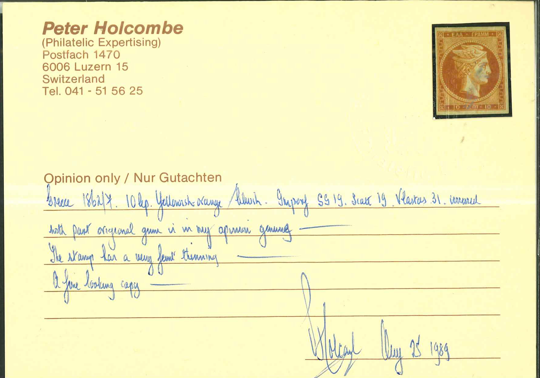 1862-67 Consecutive Athens printings 10 lepta yellow-orange mint part o.g. with very large even margins, very faint thinning, fine; cert. Holcombe (1989). (Image 1)