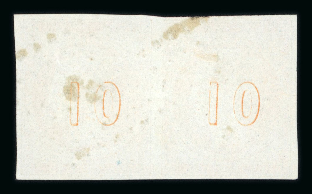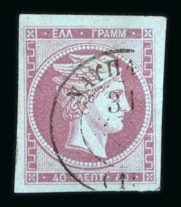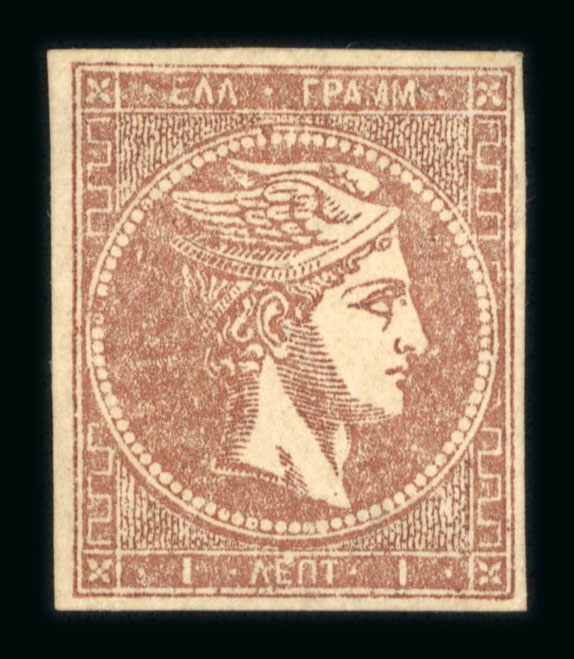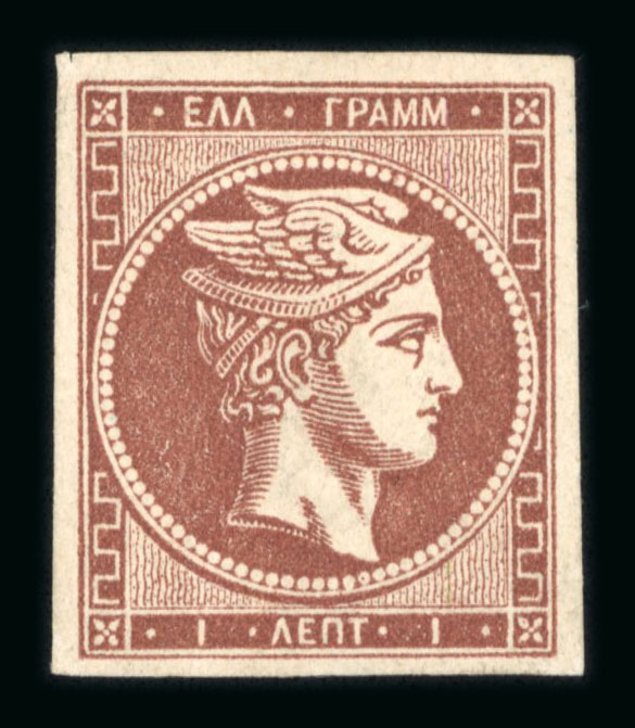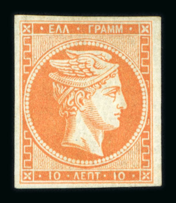 1862-67 Consecutive Athens printing 10 lepta orange unused, very good even margins, with control numbers displaced (position 56) variety (Coundouros 30.7), exceptionally fine printing (May 1862) and extremely rare. (Image 1)