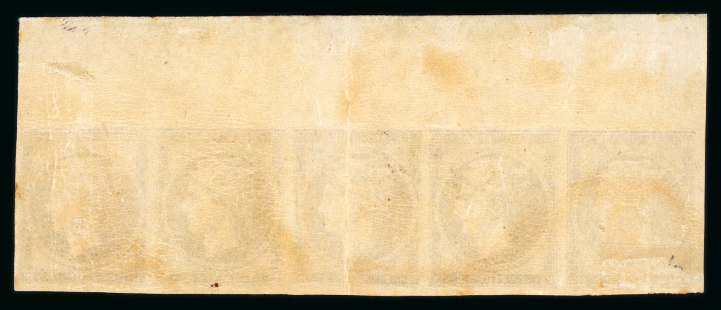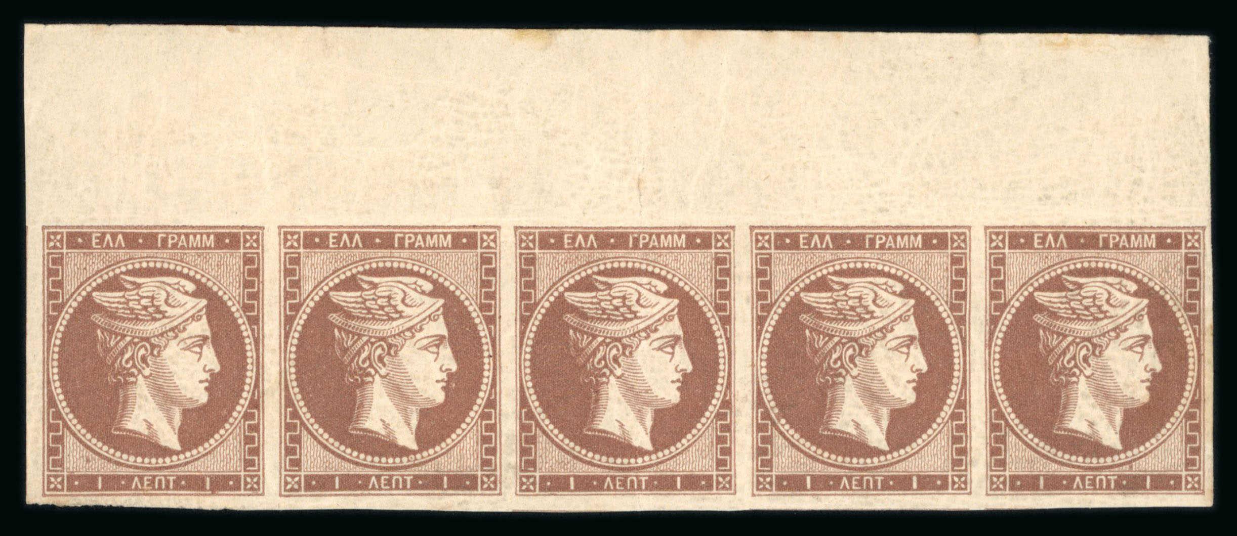 1 lepton Consecutive Athens printings (1862-1867) - Milky brown marginal strip of five. Light vertical crease in the middle, left stamp hinged, the other unhinged, fine to very fine. (Image 1)