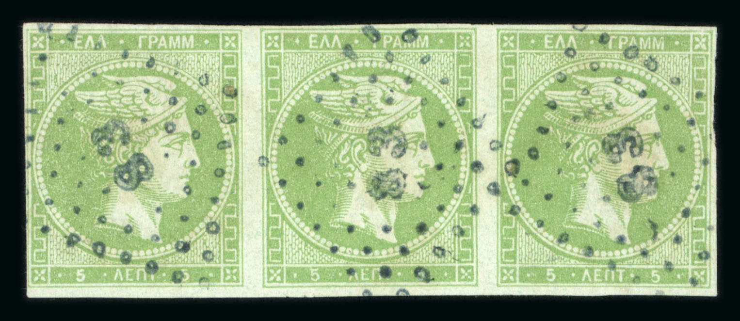 5 lepta Consecutive Athens printings (1862-1867) -Dotted cancel "83" of Skyros (Type I) - strip of three. Very rare destination. Close to good margins, fine condition. Signed Macoveanu. (Image 1)