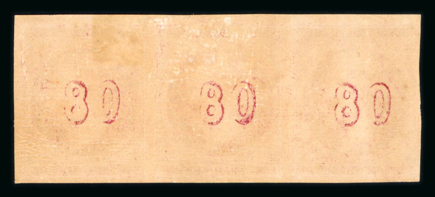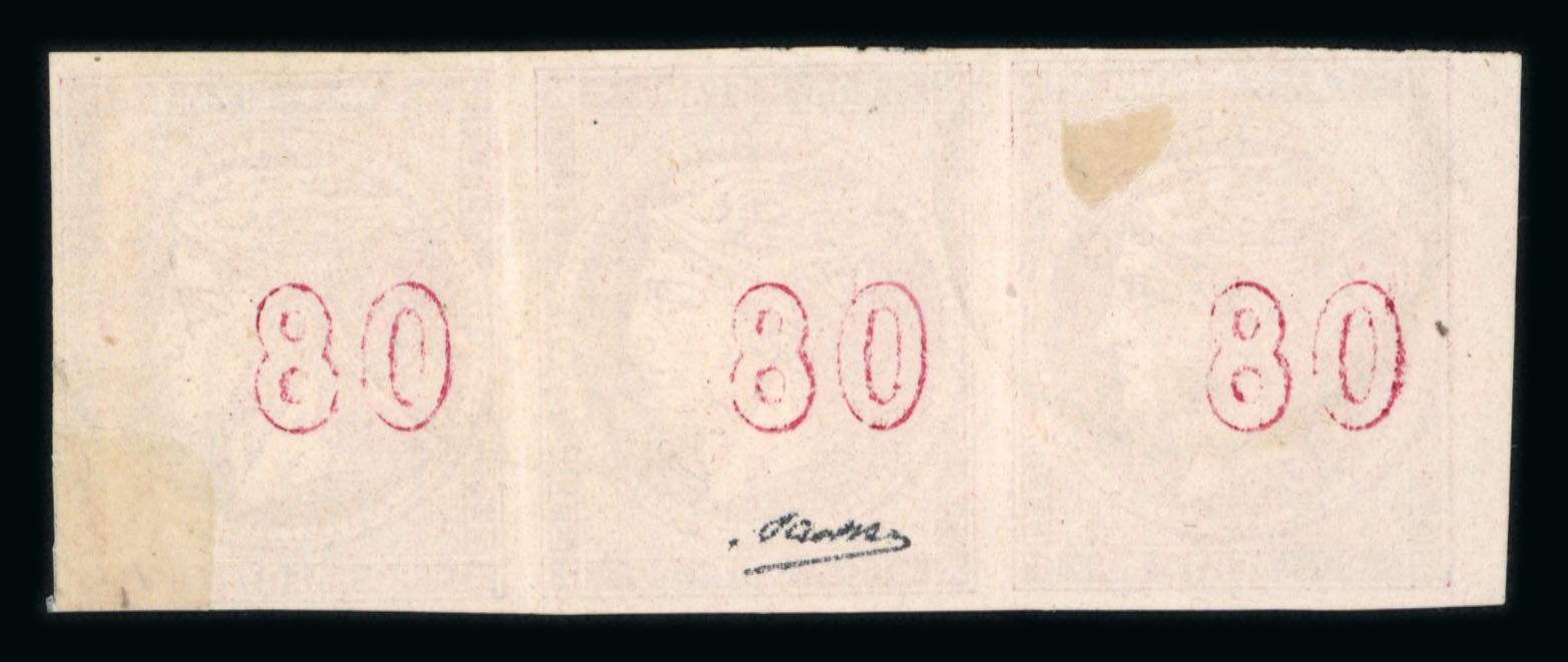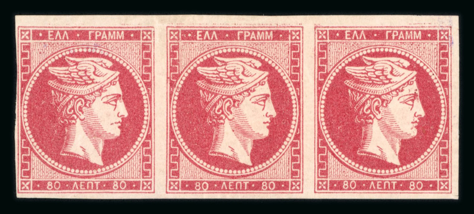 80 lepta Consecutive Athens printings (1862-1867) marginal strip of three - Mint, light hinge remnant. Good margins, very fine. (Image 1)