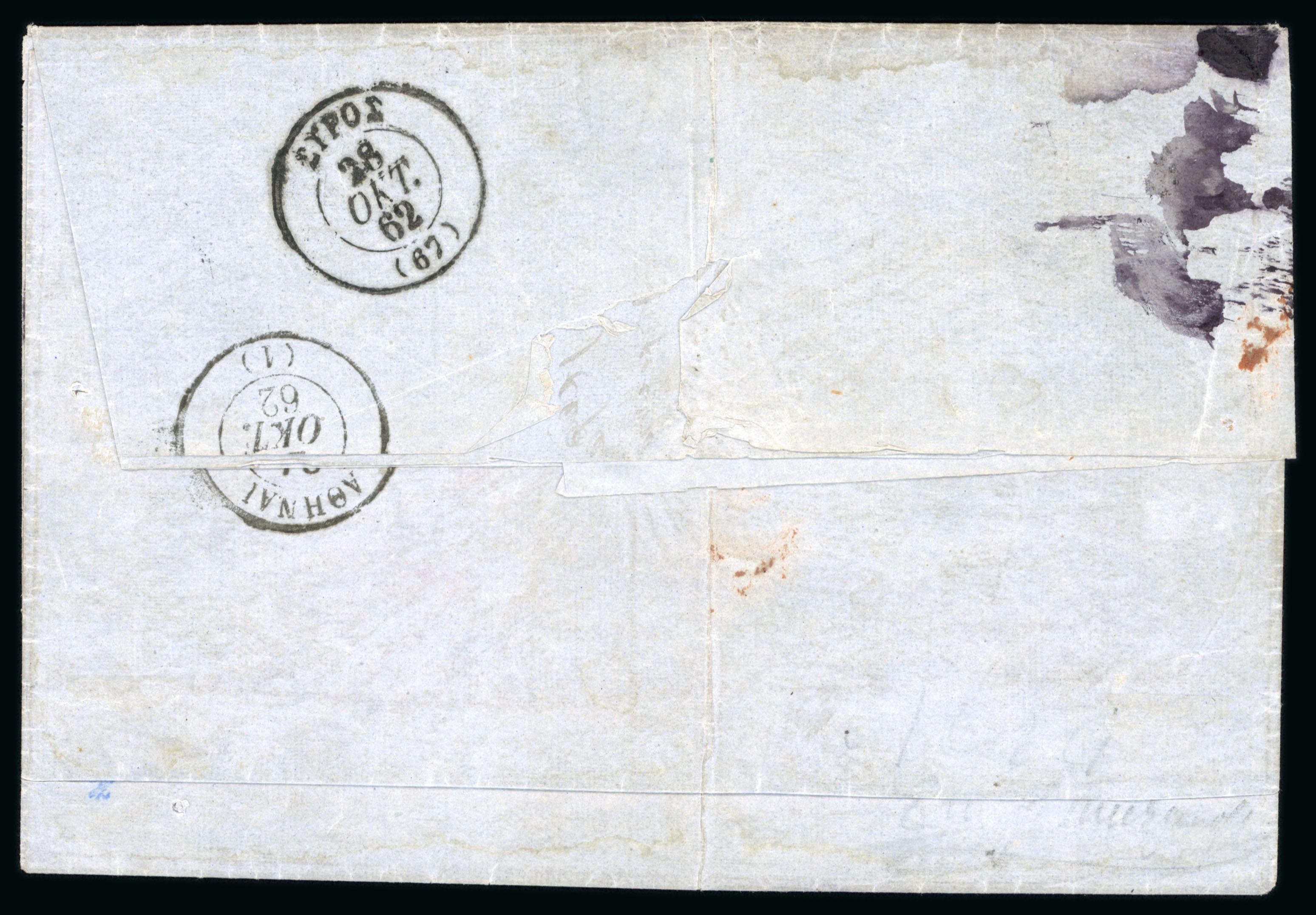 20 lepta blue, showing control figure "80" instead of "20", good to large margins, tied on 1862 cover from Nission to Syros, stamp removed for examination and placed back, very fine and an extremely rare usage of the control number error