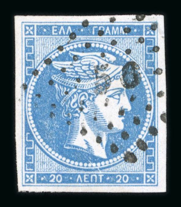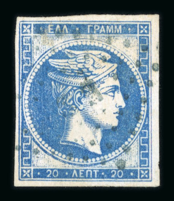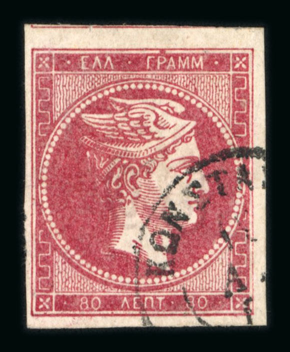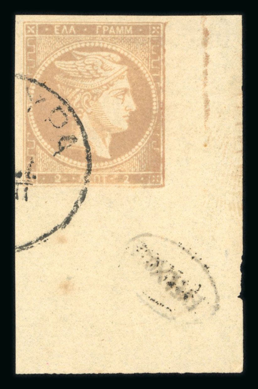 1868-69 "Cleaned plates" printings 10 lepta red-orange used with Nafplion Type II cancel showing double control numbers variety (Coundouros 37.2), three margins otherwise fine and very rare. (Image 1)