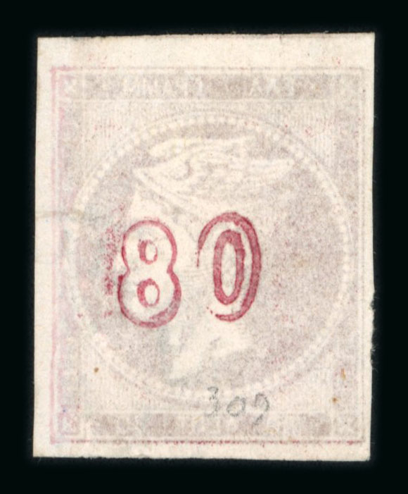 1873 "Cleaned plates" printings 80 lepta rose-carmine used strip of three cancelled by Type II cds, good to large margins, slightly heavy hinge, a fine and scarce multiple. (Image 1)