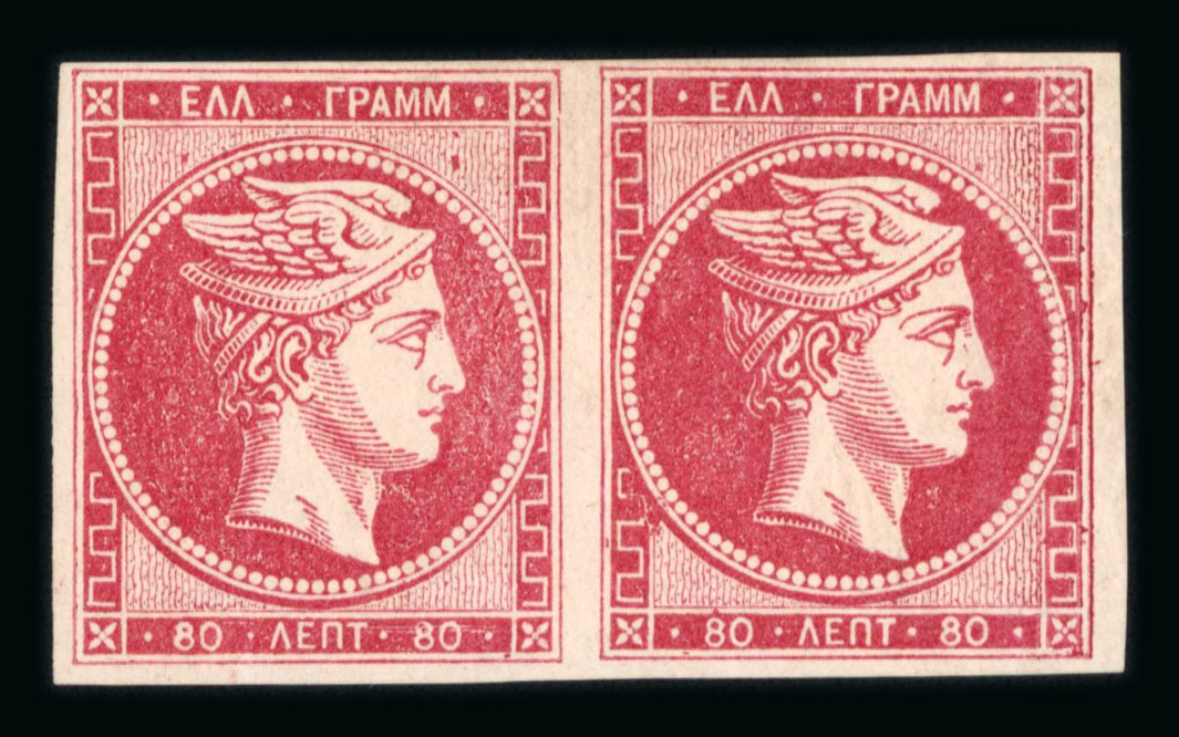 80 lepta rose carmine, mint horizontal pair, with good to large margins, right stamp showing only a small trace of the "0" on the control figures, plus left stamp with white lines in value tablet, fresh, very fine and a very rare variety