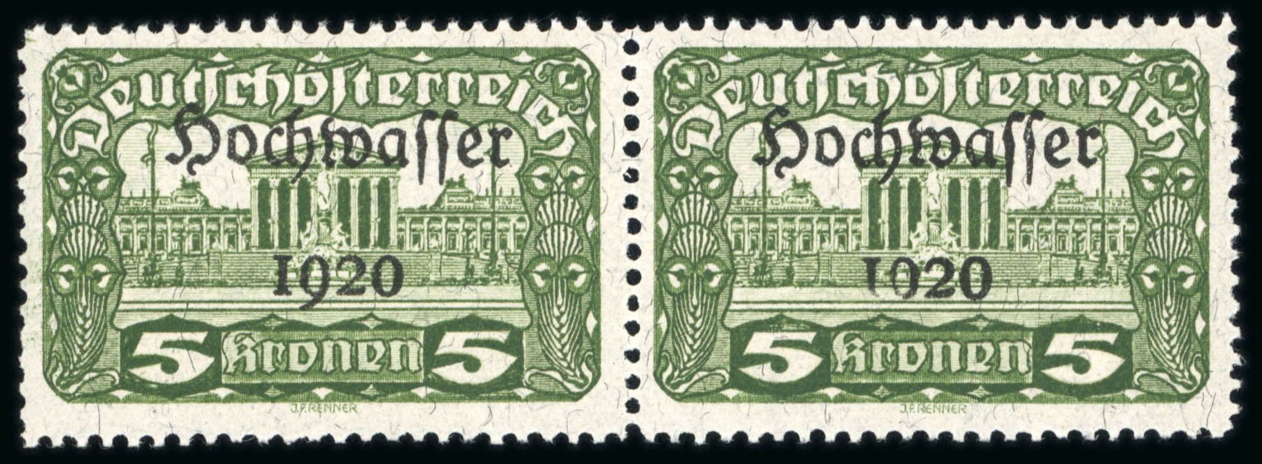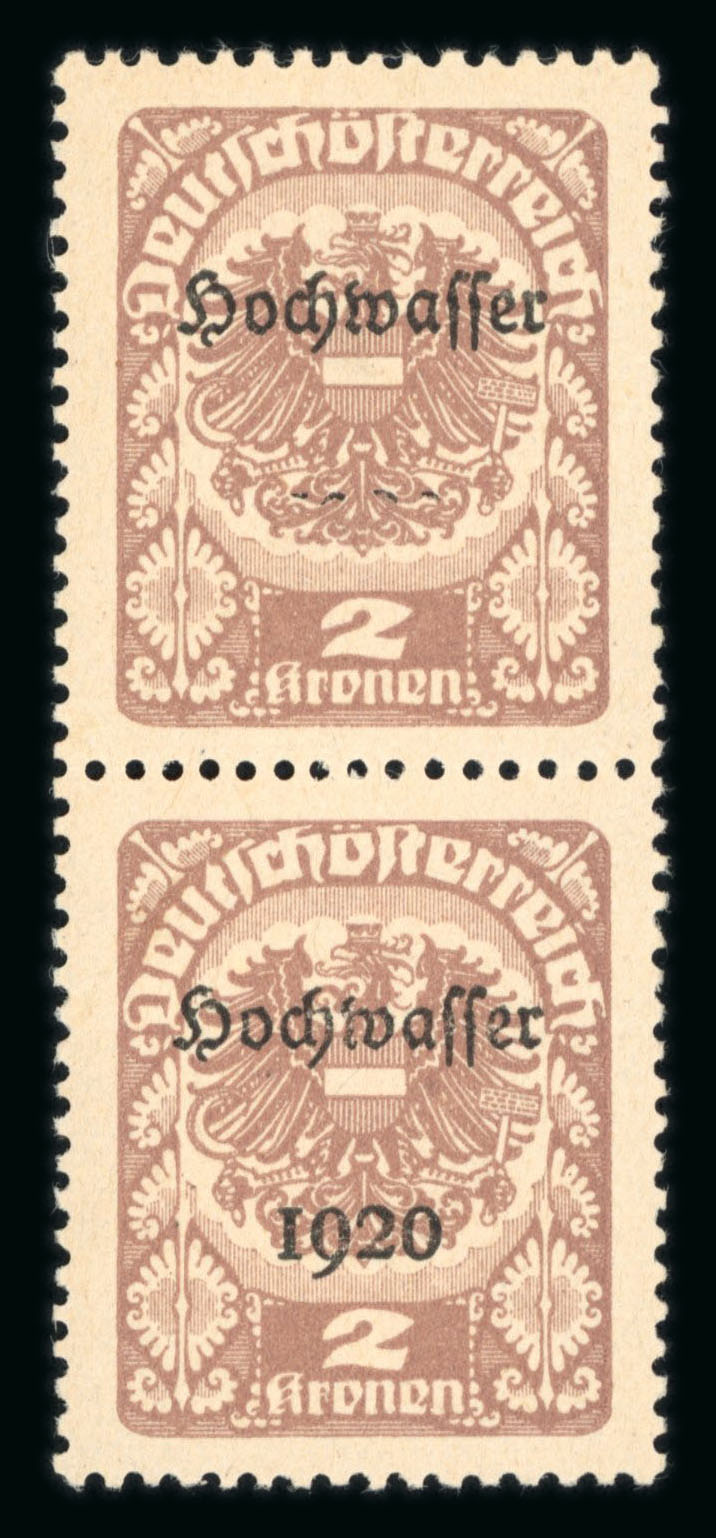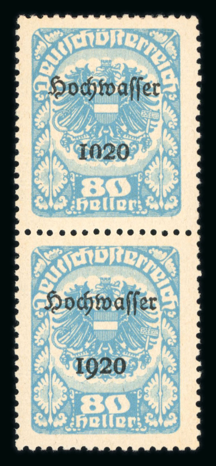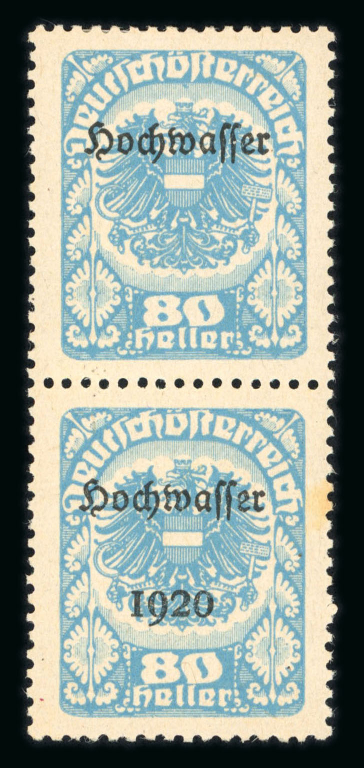 1921, Hochwasser 80H h'blau in senkrechtem Paar mit und ohne '1920', ungebraucht, seltenes Stück, signiert Wallner und Matl, Attest Soecknick, ANK 349 A I, € 1800 für postfrisch. (Image 1)