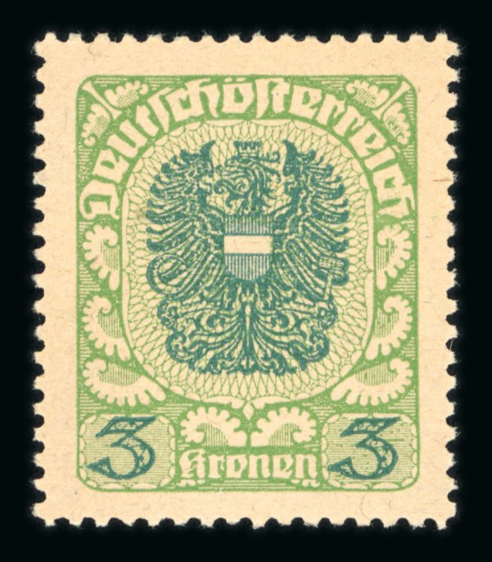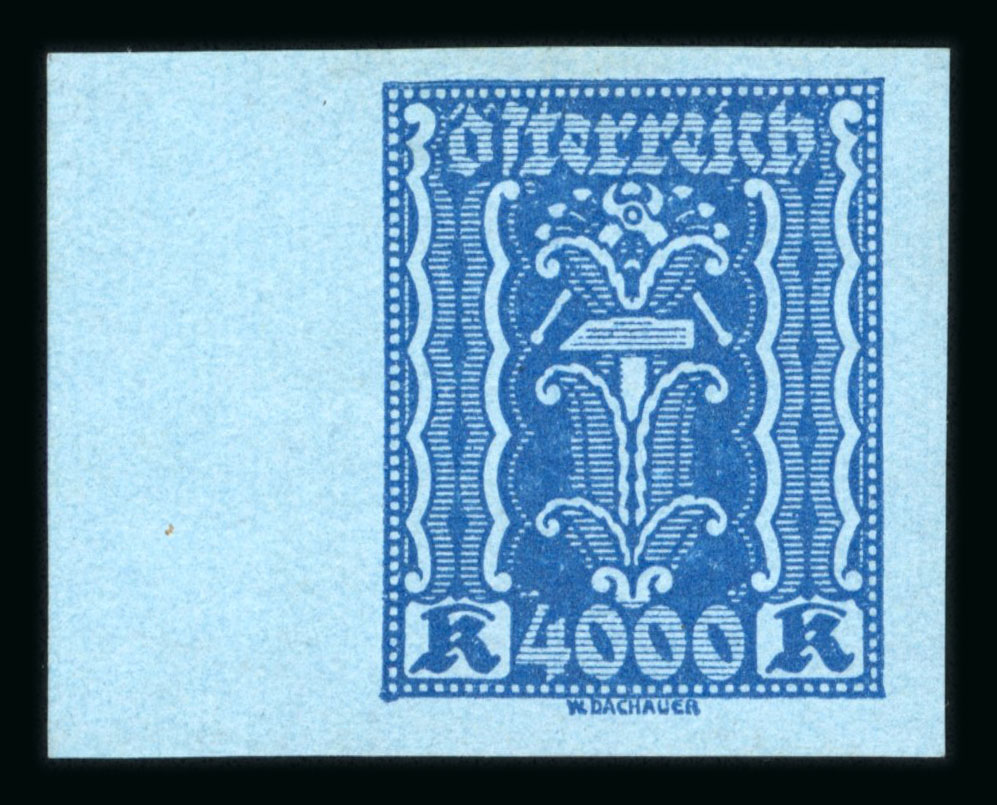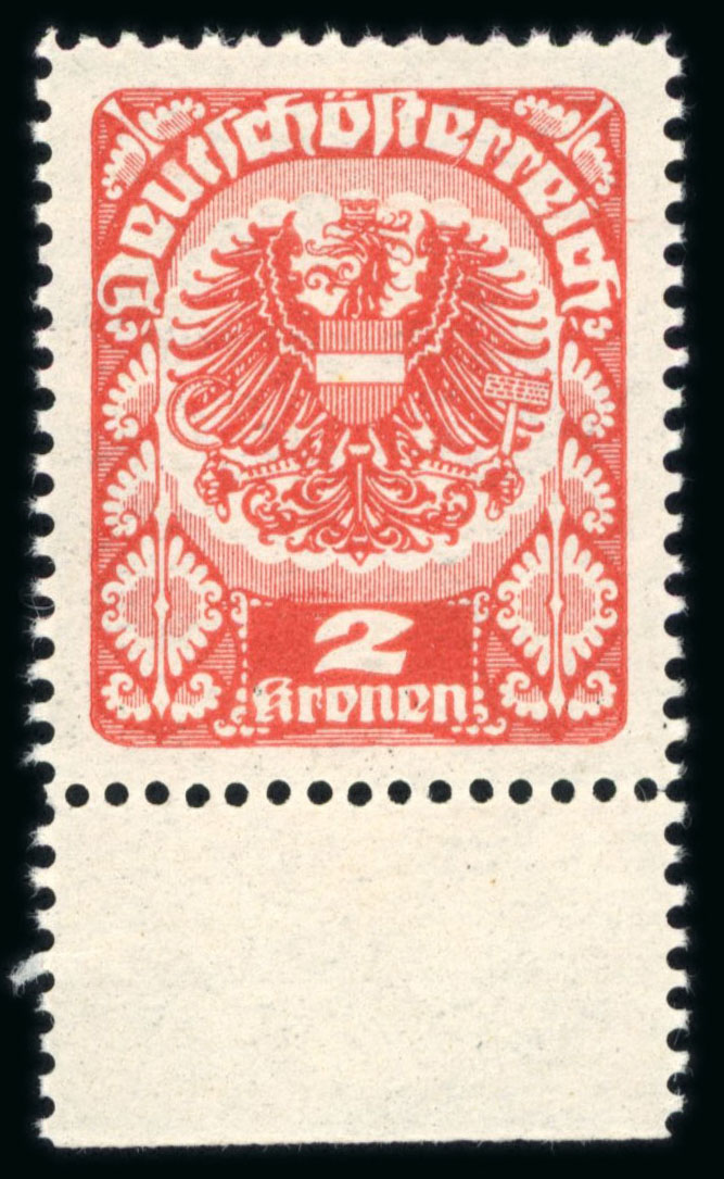 1920-21, Wappenserie 2K in Farbprobe rot in Linienzähnung, postfrisches Unterrandstück, selten, ANK und Mi 315 P, €400. (Image 1)