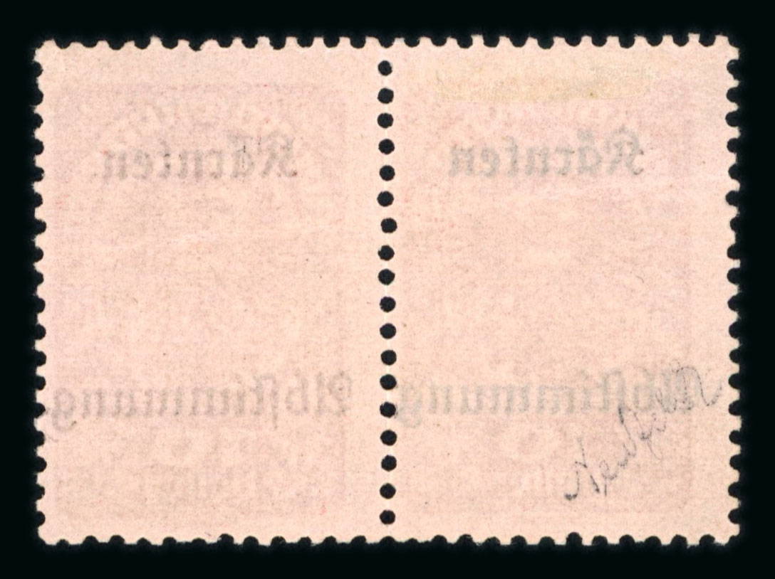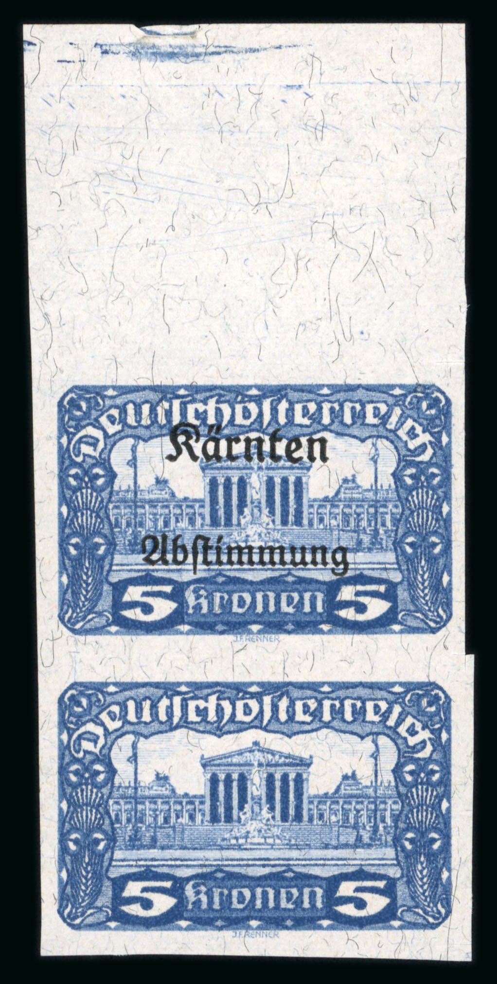 1920, Kärnten Abstimmung 5K Parlament in senkrechtem Oberrandpaar mit rarer Abart: mit und ohne Aufdruck, auf ungummiertem Papier, Attest Soecknick, ANK 336 Abart, ANK und Mi unbekannt. (Image 1)