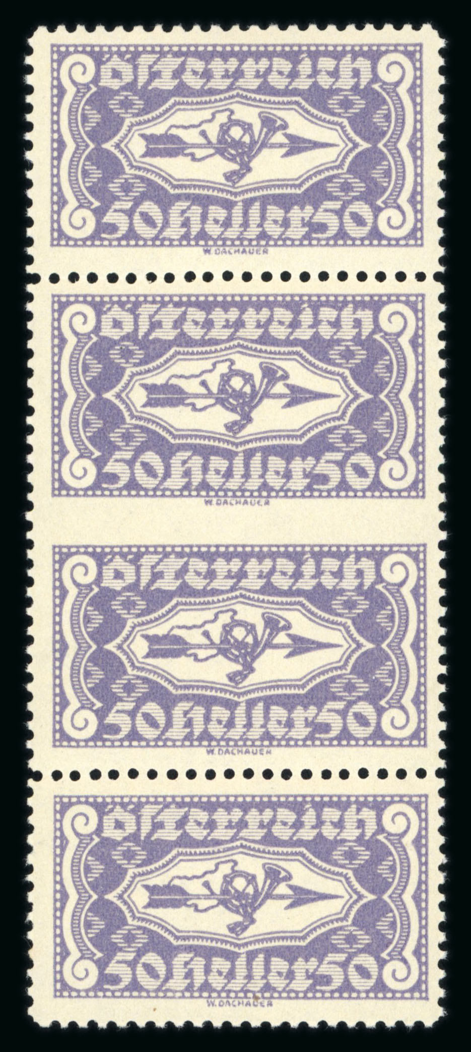 1921, Eilmarke 50H in senkrechtem Viererstreifen, dabei 2.-3. Marke UNGEZÄHNTE Mitte, postfrischer Prachtstreifen und seltenes Paar, Attest Puschmann und Soecknick, ANK und Mi 417 UMw, ANK und Mi €1500. (Image 1)