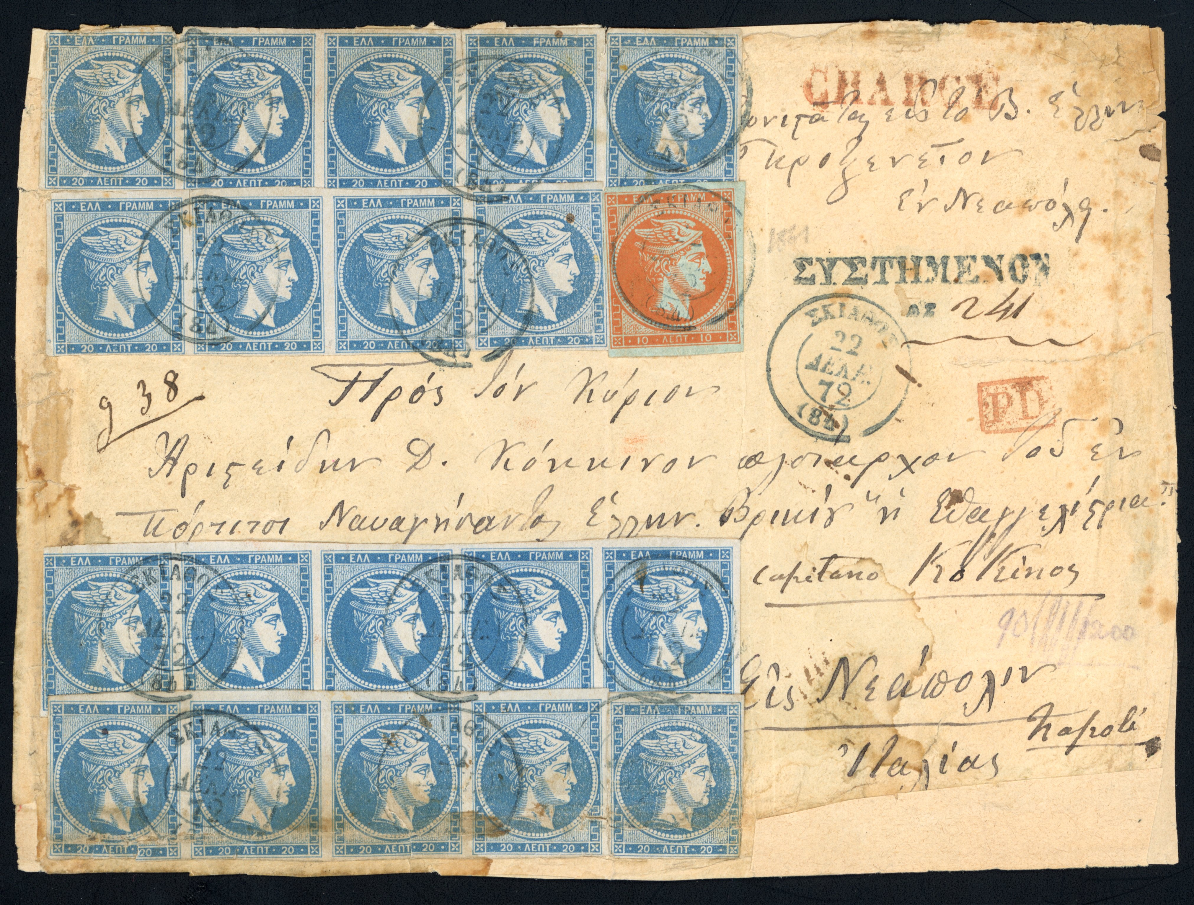 1871-72 20 Lep blue, two strips of five + two strips of four + single + 10 Lep single, all tied by scarce SKIATHOS cds's on cover front sent 1872 (Sep 22) to Napoli, there are a few faults as expected but the whole is full of character and must be