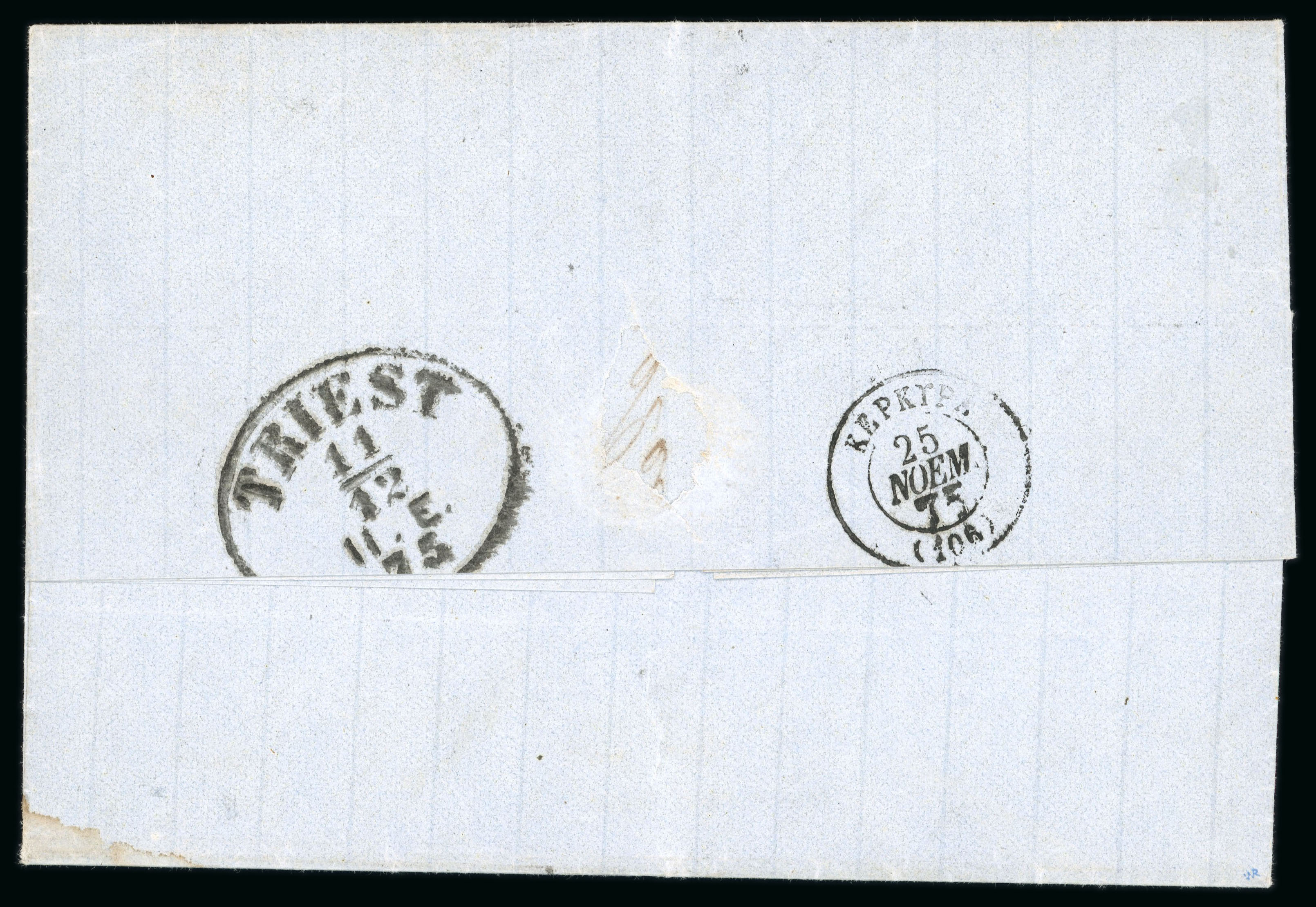 1875 Paid letter from Patras (Nov. 23rd/Dec. 5th, 1875) to Trieste (Nov. 30th/Dec. 11th, 1875), via Corfou (Nov. 25th/Dec. 7th, 1875). Franked at 30 lepta The UGP rate in used since July 1st, 1875 for an international letter up to 15