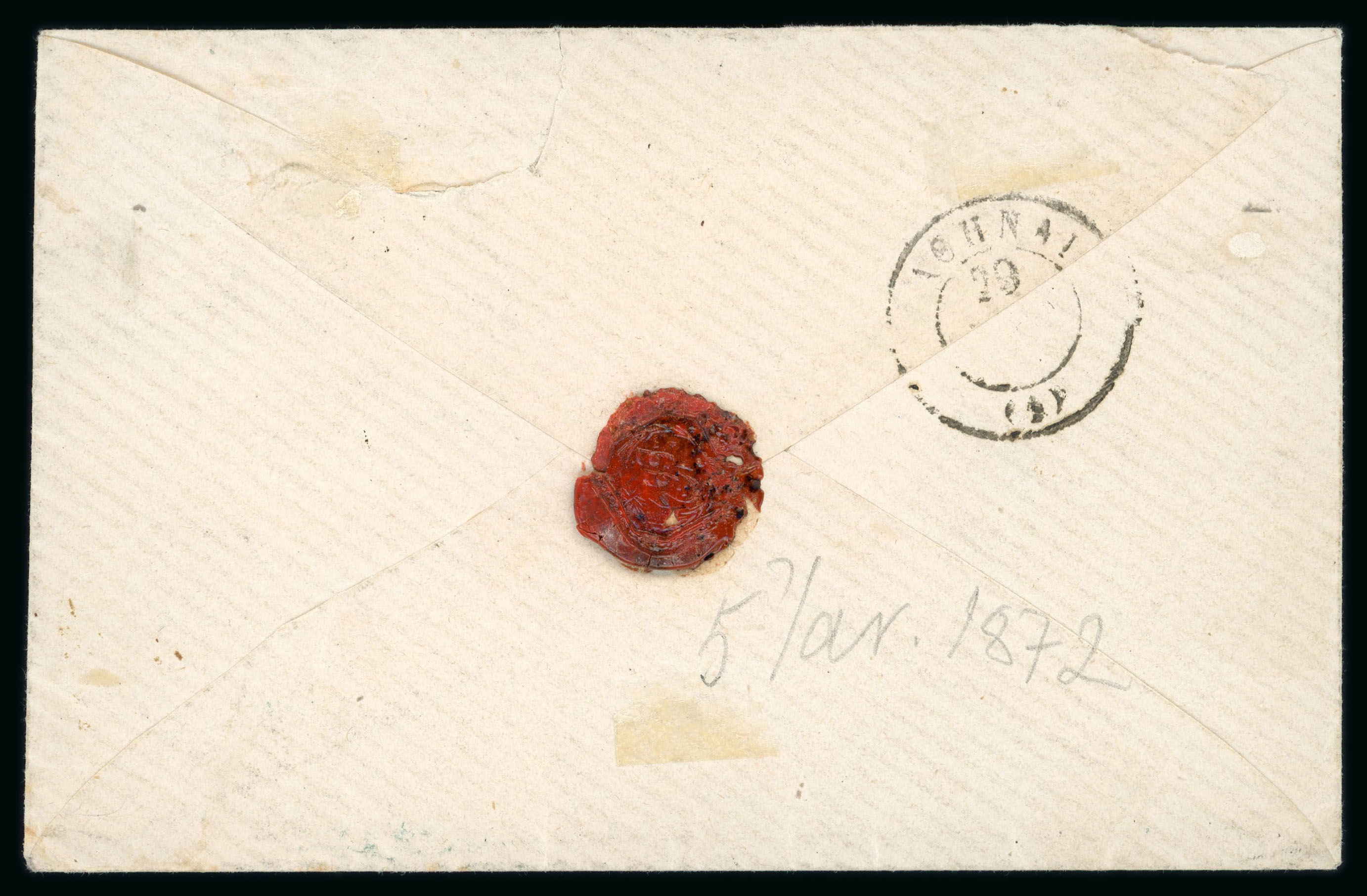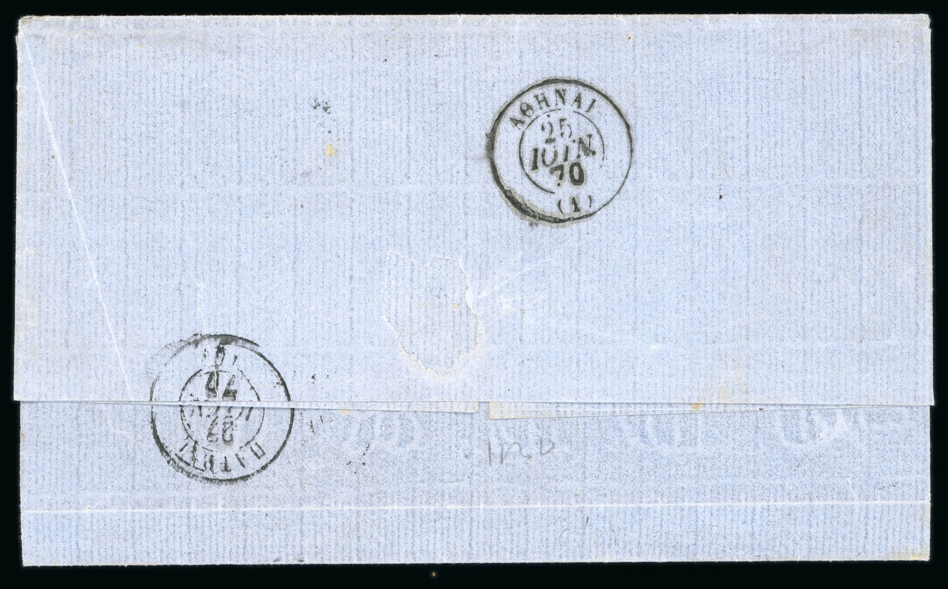 (single rate) according to the 1866 convention between Greece & France. Red postmark "PD" for "Paid to destination". The 3 stamps are from the meshed papers printings (1871-1876). Good to very large margins. (Image 1)