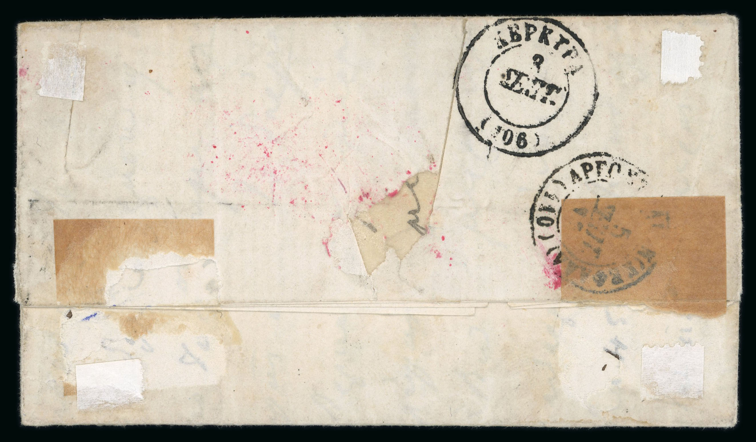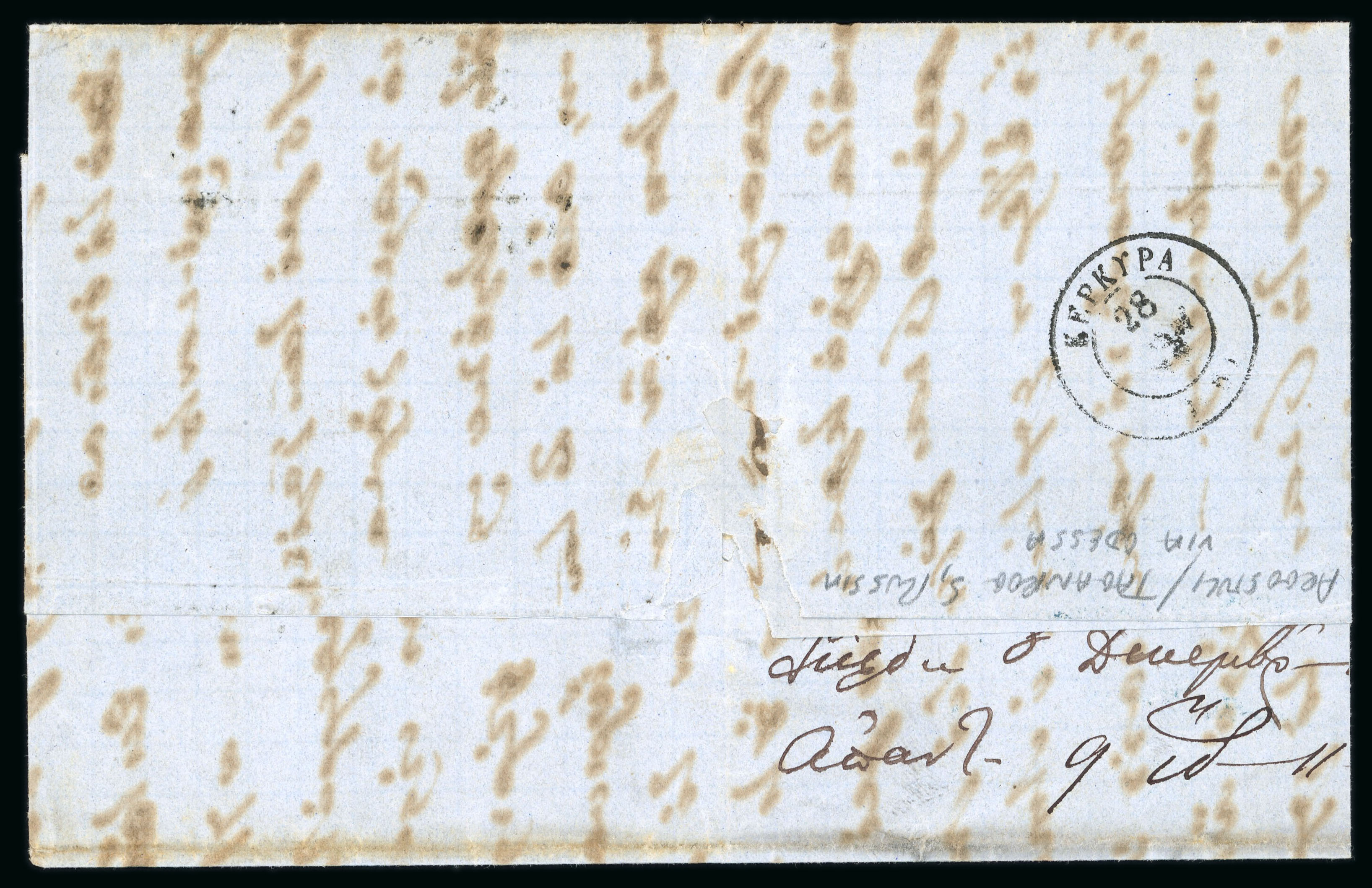 1872 Paid letter from Argostolion (Nov. 27th, 1872) to Taganrog, via Corfou (Nov. 28th, 1872) and Odessa (Dec. 4th, 1873) by the land route of Vienna. Franked at 100 lepta for a letter up to 15 grams according to the 1867 convention