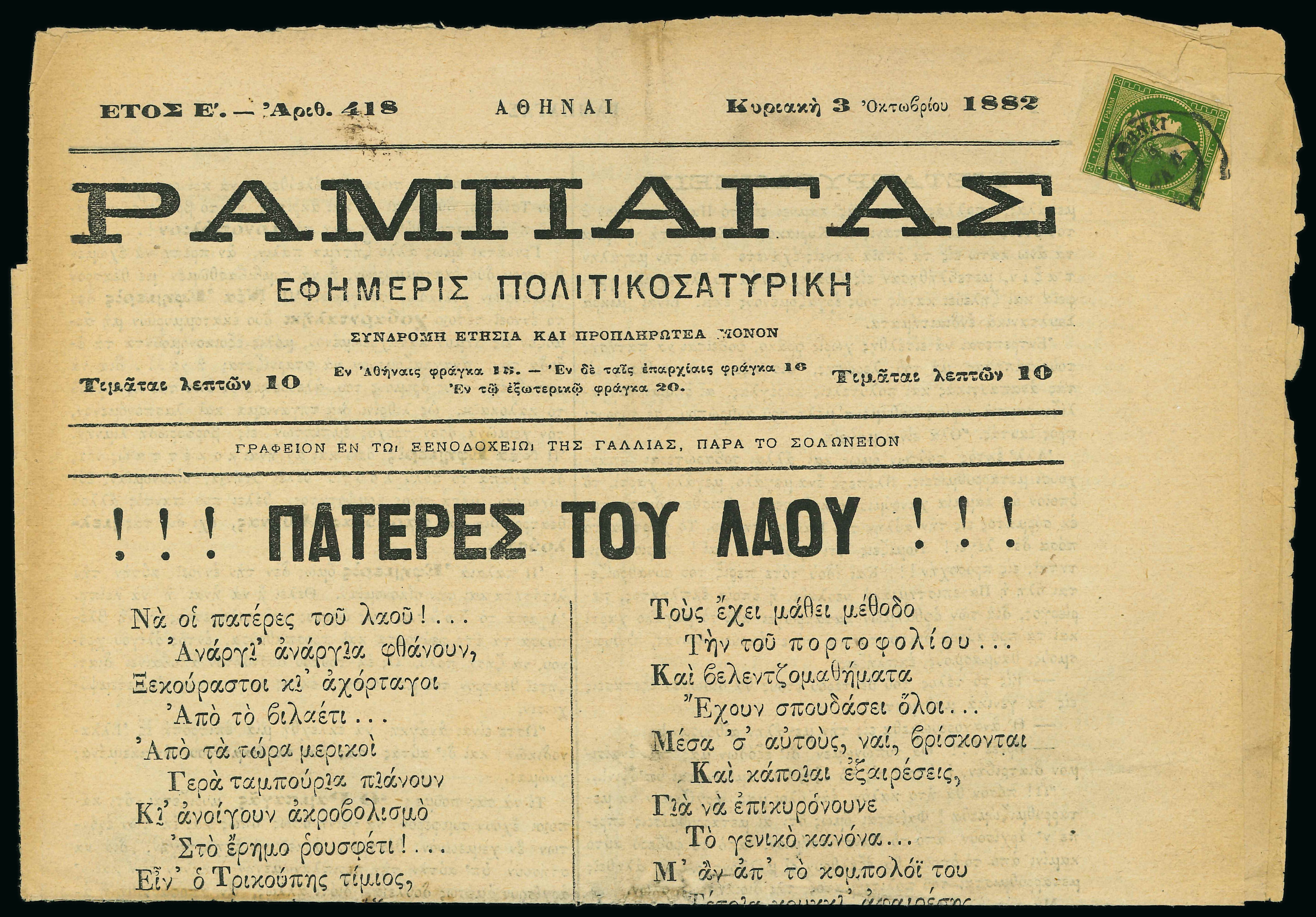 1882 Periodical "𝛲𝛢𝛭𝛱𝛢𝛤𝛢𝛴" of October 3rd, 1882 sent from Athens and franked with 5 lepton, the rate for newspapers up to 30 grams sent abroad, with a 5 lepton of the Cream papers w/o CN printings (1880-1882). (Image 1)