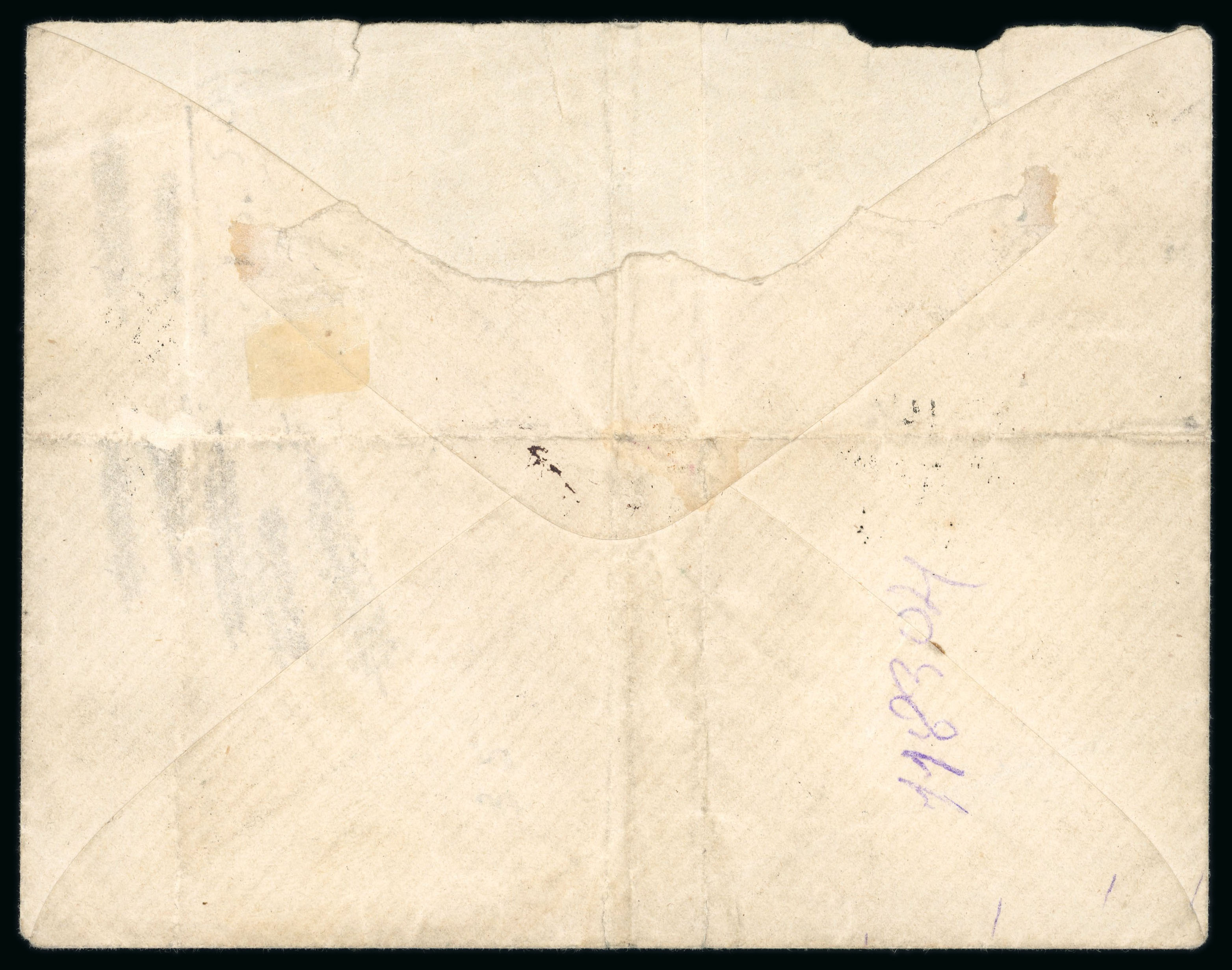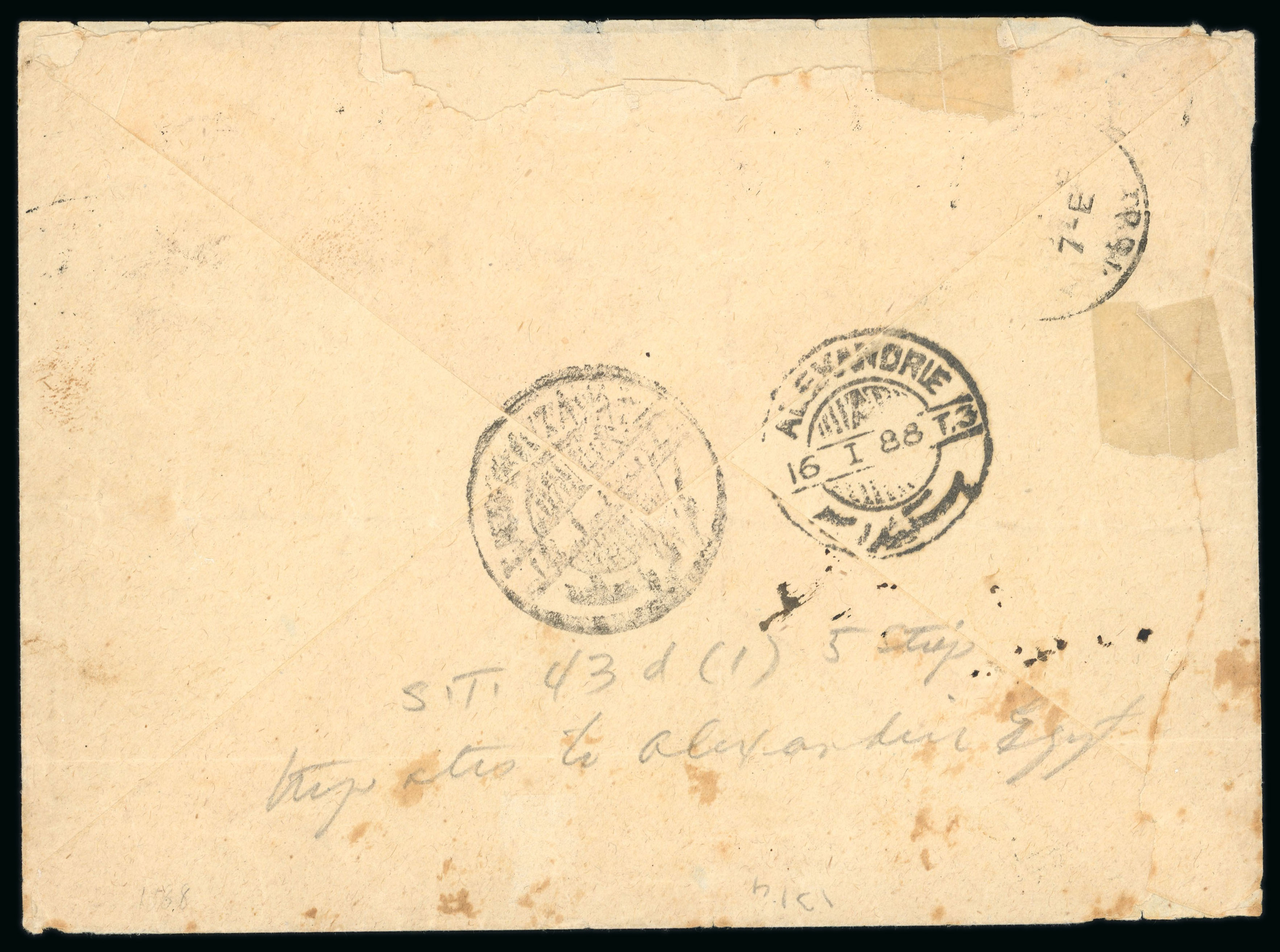 1887 Prepaid letter sent from Tripoli (18) on December 31st, 1887/January 12th, 1888, arrived in Alexandria, Egypt on January 4th/16th, 1888, franked at 25 lepta, the U.P.U. rate (1878 Paris treaty). The strip of five of the 1 lepton is